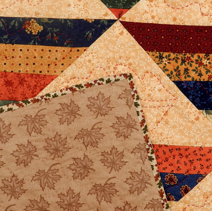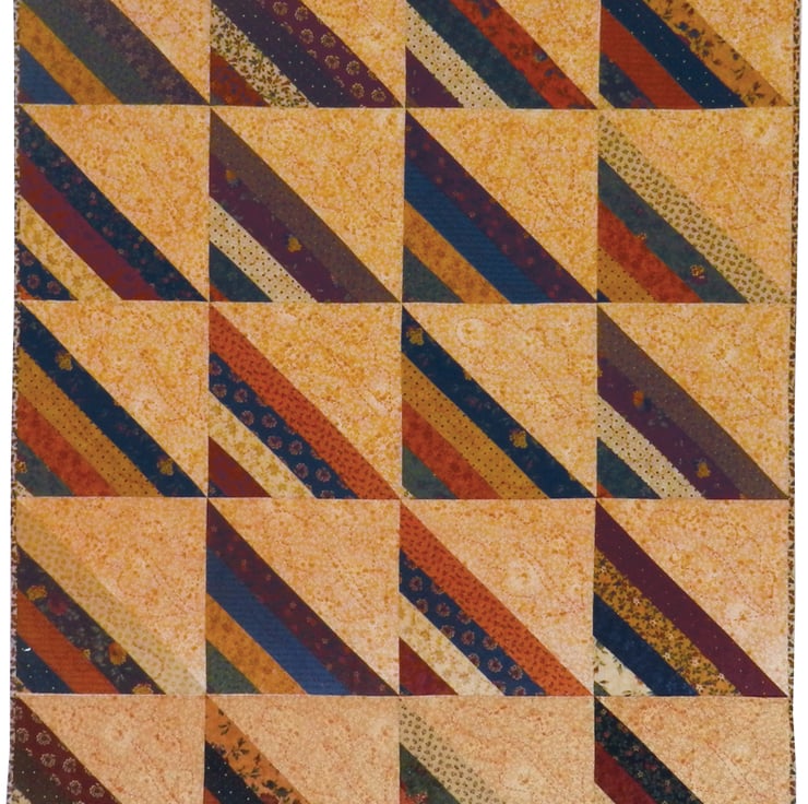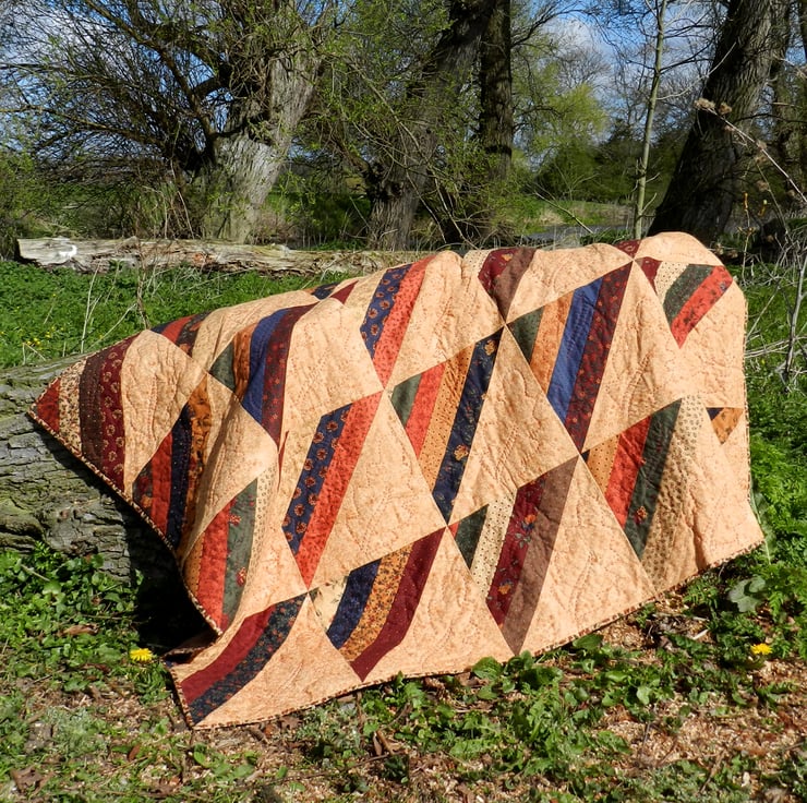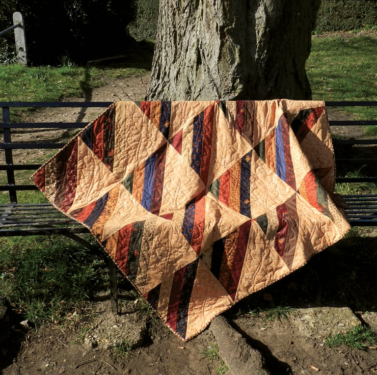 A cosy quilt with an autumnal theme and colourscheme, created from 20 blocks (4 x 5) of the pattern known as Roman Stripes or Amish Stripes.