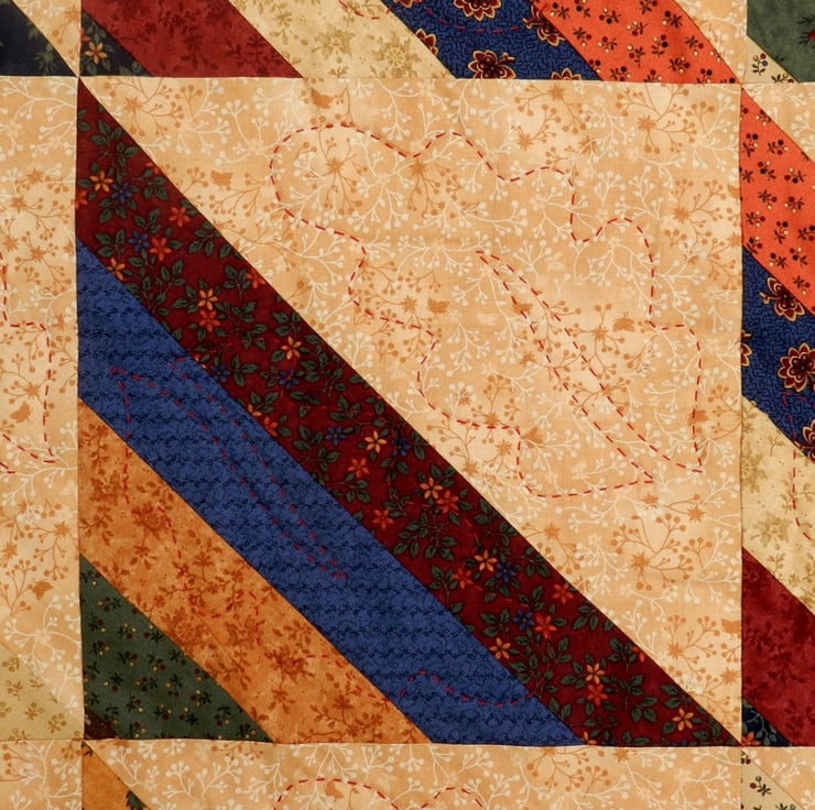 Machine-pieced strips of print fabrics in browns, ochres, and dusky greens and blues create one triangular half of each patch, with a triangle of tan print completing the square. Each block is hand quilted with two oakleaf motifs using big-stitch quilting in red-brown coton a broder.