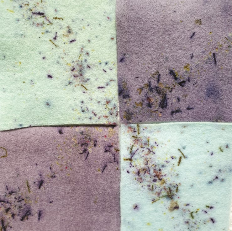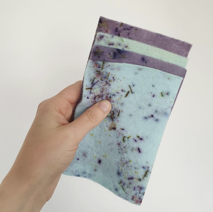 100% wool felt sheets in naturally dyed spring tones inspired by bluebells made from woad, logwood and weld, with speckles from logwood, onion skins, weld, hibiscus, rose leaves and cochineal.