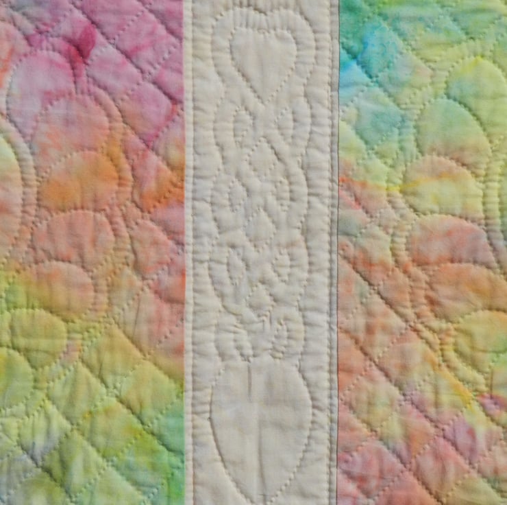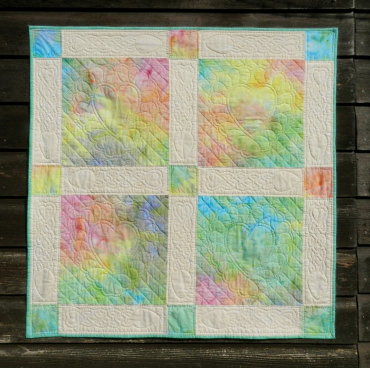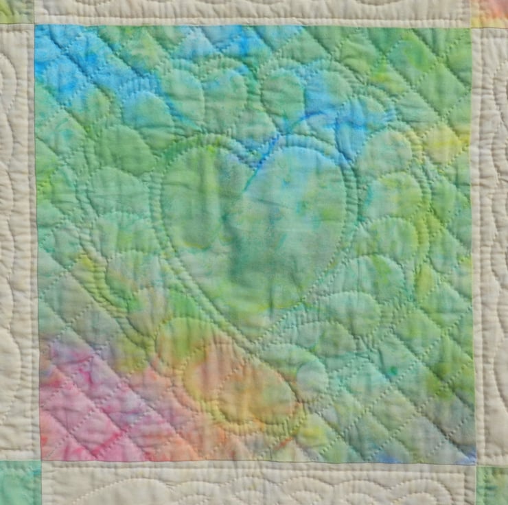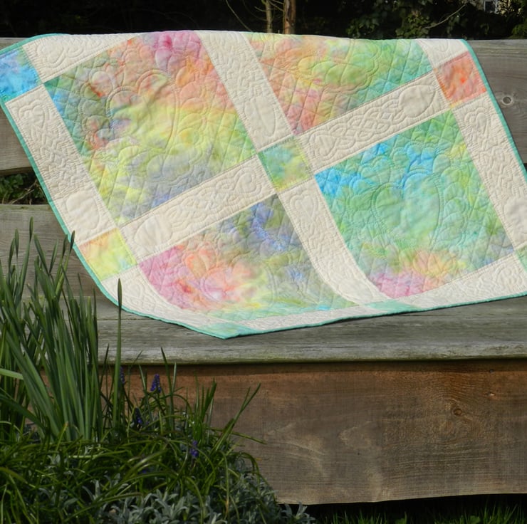 I used a variegated batik fabric in soft colours for the large and small squares, and cream cotton for the sashing strips; the binding is in a soft turquoise green. The patches are machine-pieced, then hand-quilted throughout.