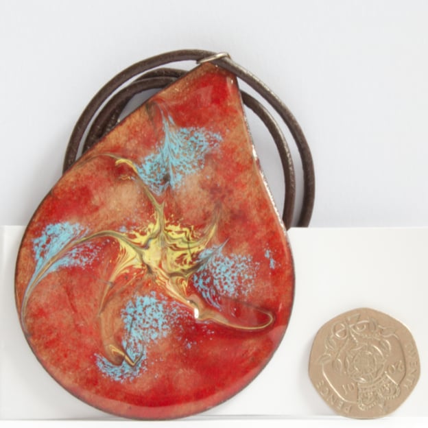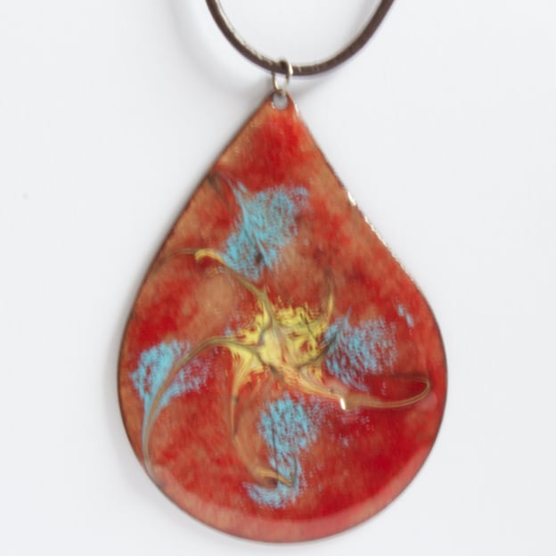 The scrolled decoration on the pendant is a unique, random pattern. Random in the sense that I have little, if any, control over the pattern once the pendant is in the kiln at red hot. My object is to draw through the coloured enamels scattered on the piece although, because they are red hot so not distinct from the rest of the piece. At the same time, the enamel is cooling and setting which will affect the way it responds to the steel point I use to draw the pattern. Being glass, the enamel will set smooth but may set uneven. This unevenness adds to the subtlety of the pattern. It will disturb the reflection and refraction of light on the pendant.