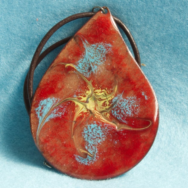 On a ground of red enamel over clear I have scrolled scatterings of turquoise and gold enamel. The copper base shows through the red, adding a shimmer of golden brown.