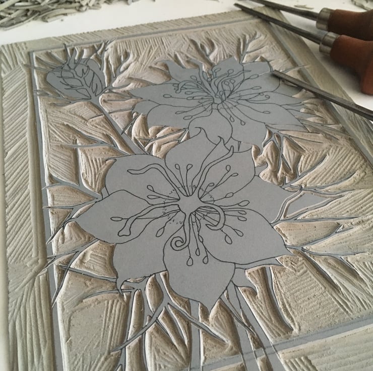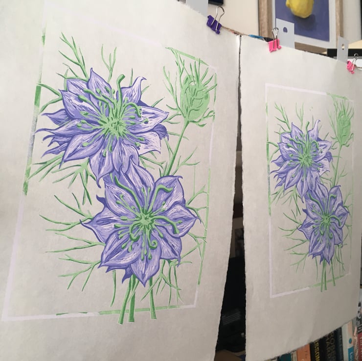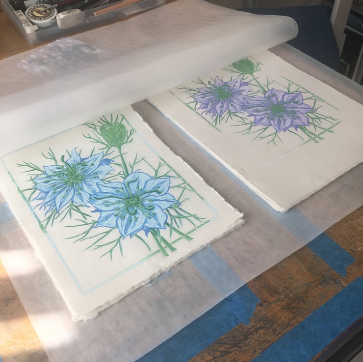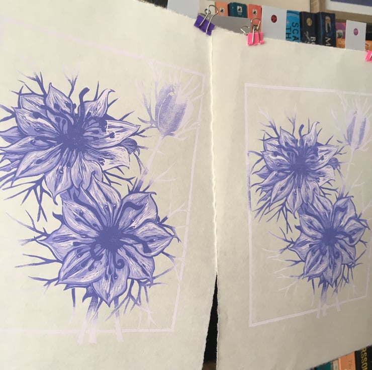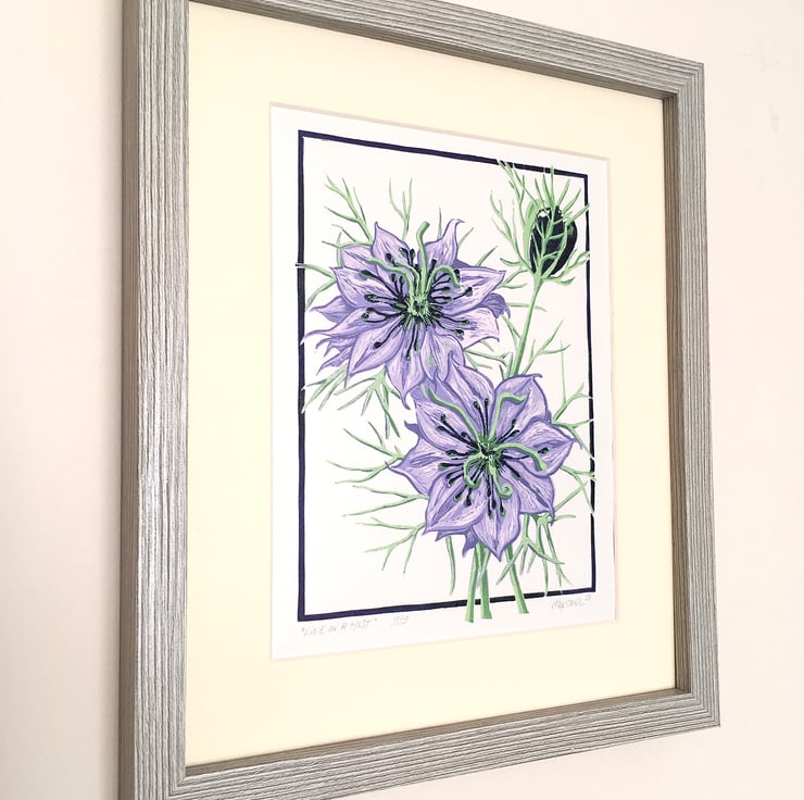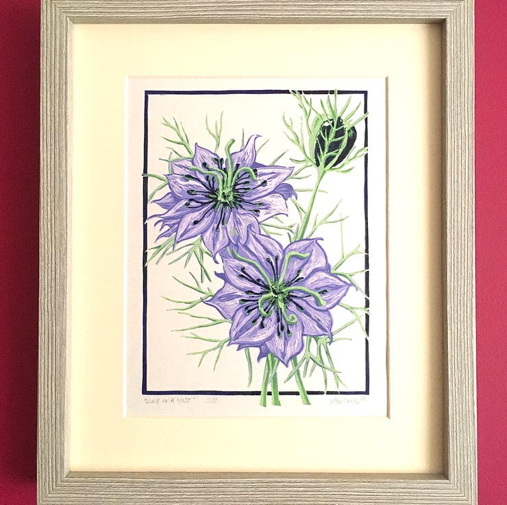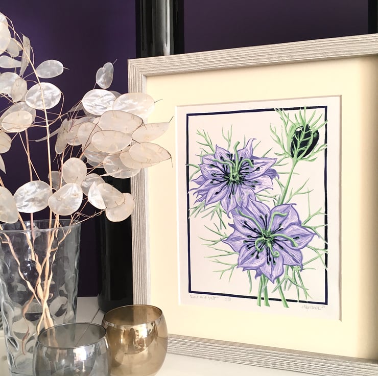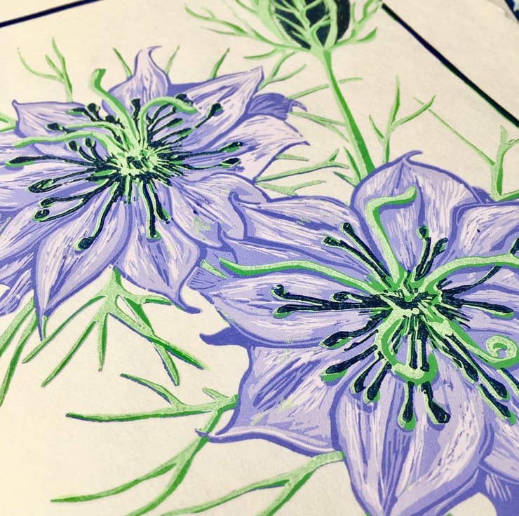 "Love in a Mist" is created using the relief printmaking method of reduction linocut printing. As each print is created by hand there may be tiny variations which add to the individual beauty of each original artwork. "Love in a Mist" is printed onto Okawara Select 51gsm printmaking paper from Awagami Factory in Japan.