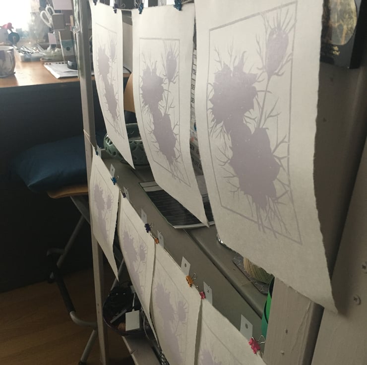 Amazingly beautiful and architectural plants, Love in a Mist (or Nigella) made for an intriguing challenge to create in print. When I was chatting to my Mum about the print she revealed that she drew a picture of Love in a Mist for her O level art!