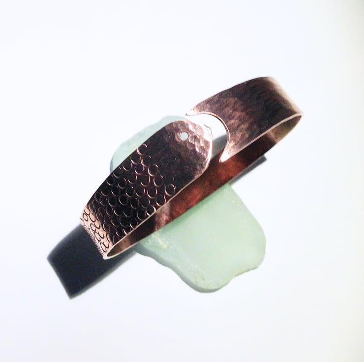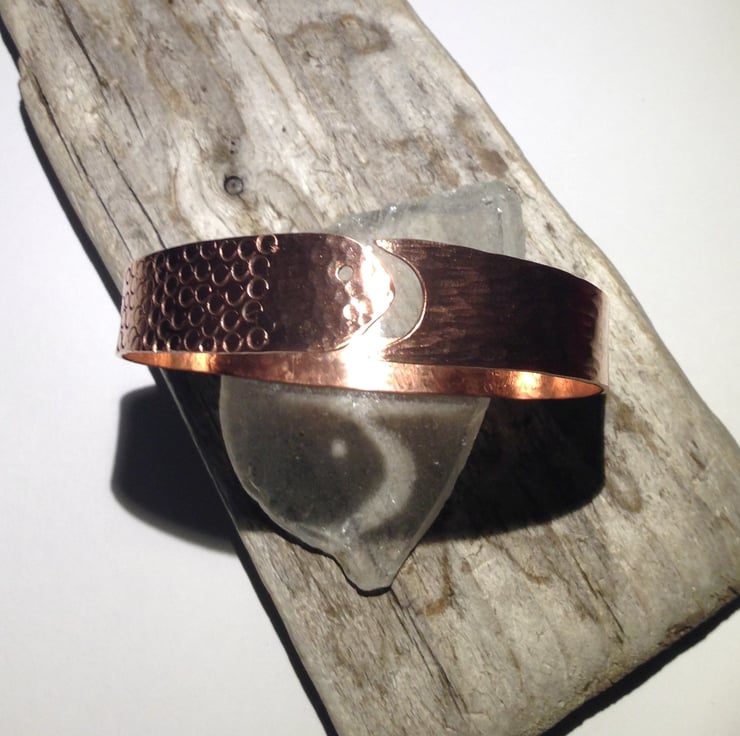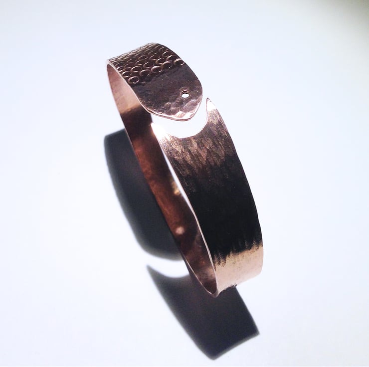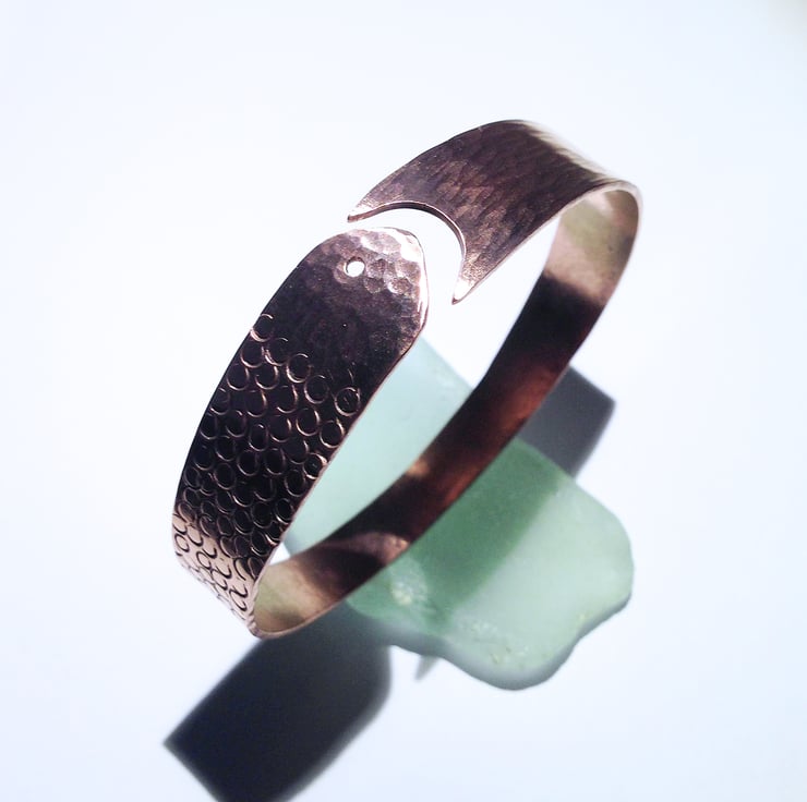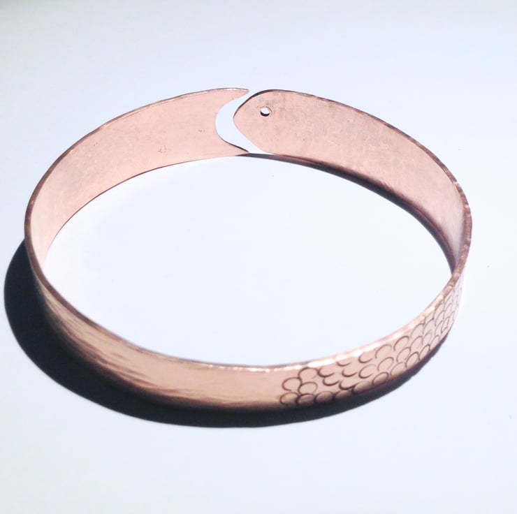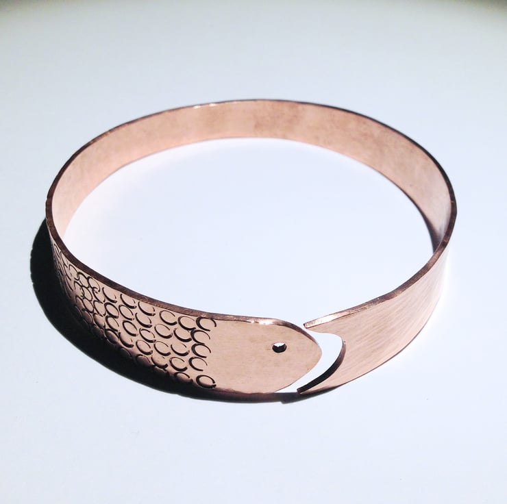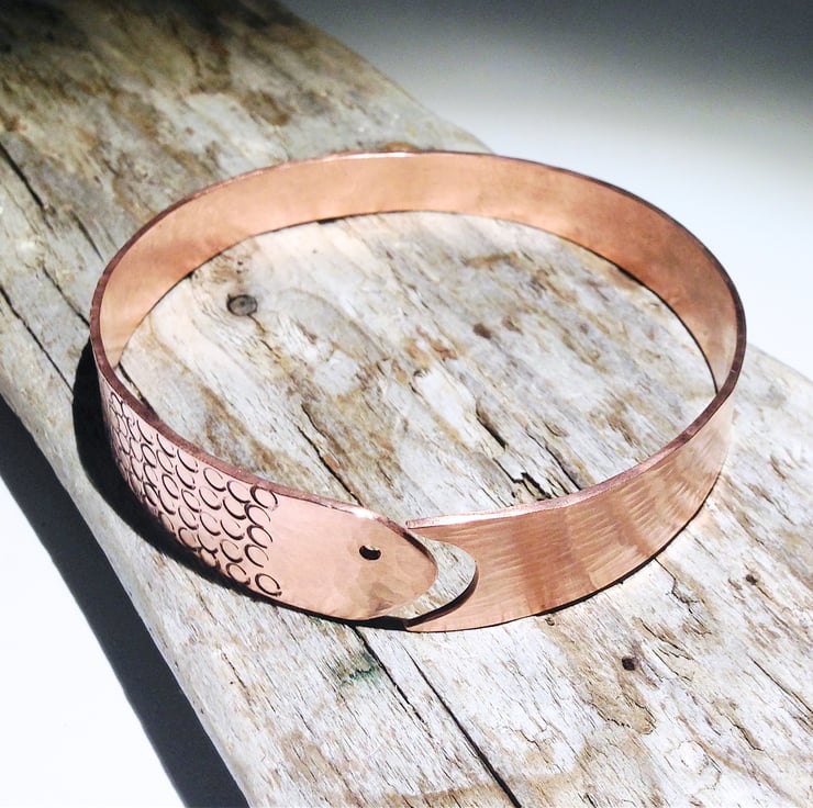 I have handmade the bangle by sawing the fish shape from sheet copper then applying a hammered textured finish and drilling a hole for the fish's eye.
