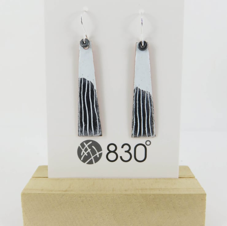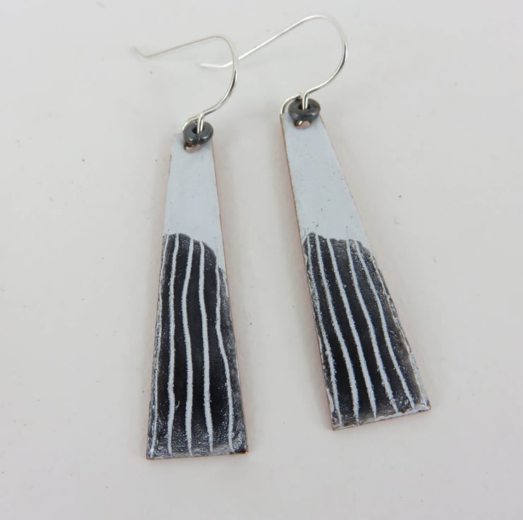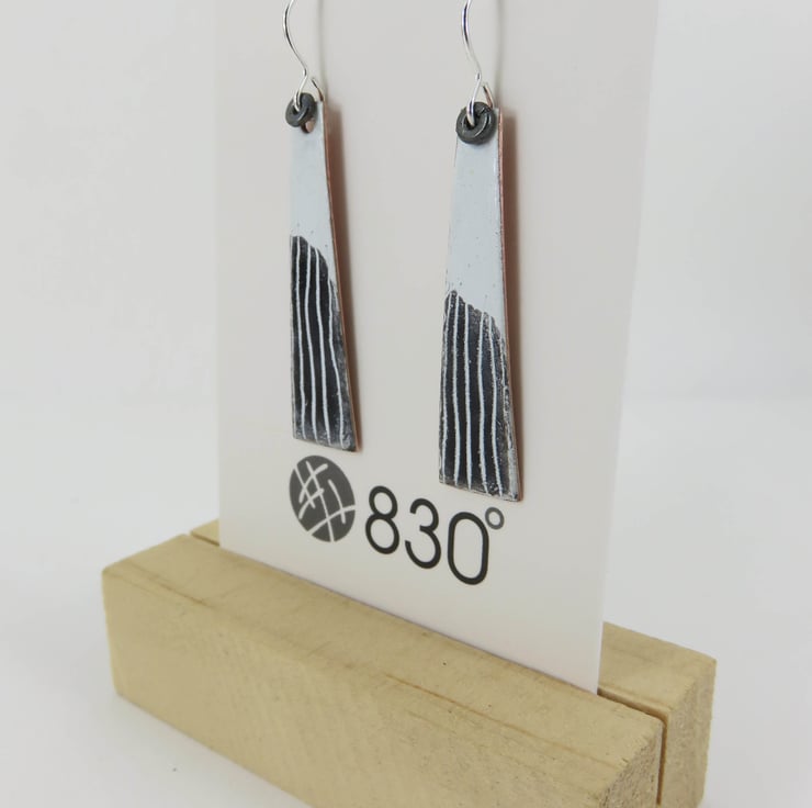 One replacement earring of the following -These dangle earrings have a 4cm x 0.8cm copper rectangle coated in enamel, on a silver wire. There is an extra layer of enamel with hand drawn detail. Fired in the kiln at 830 degrees.