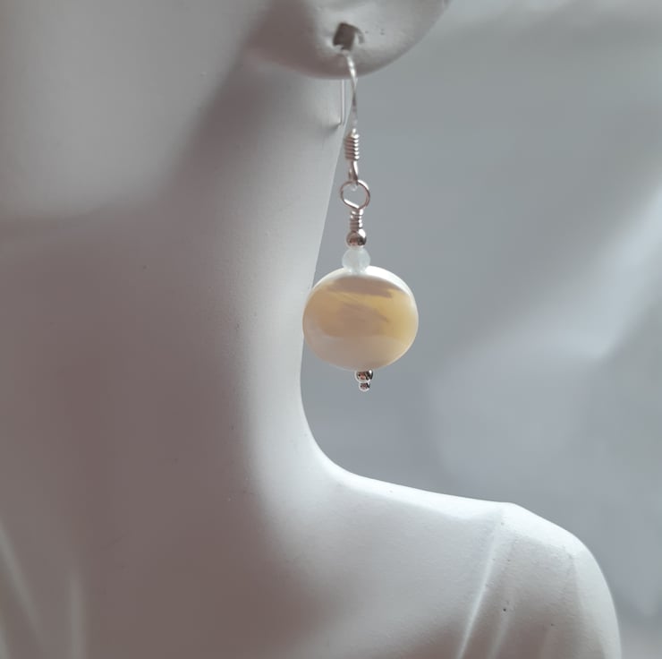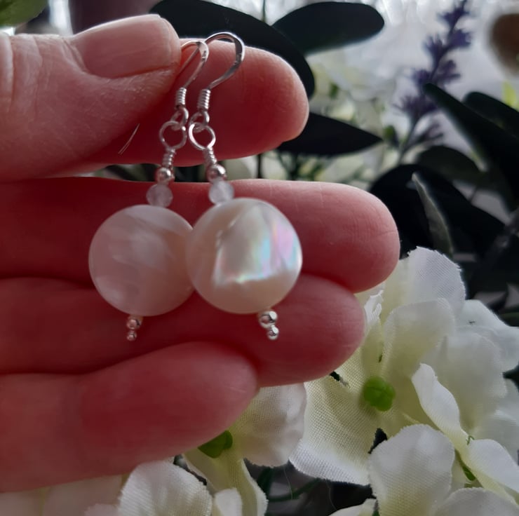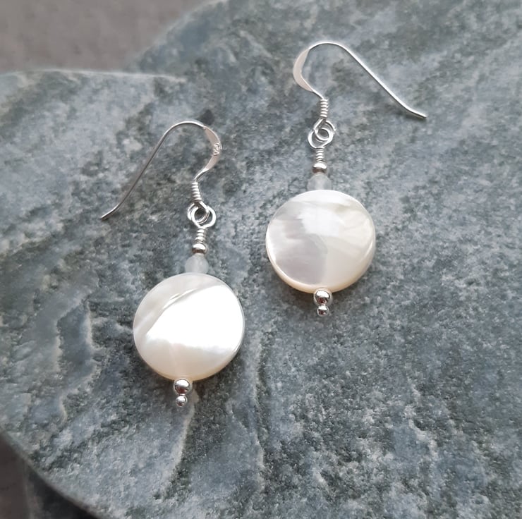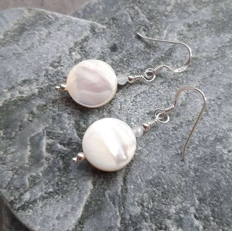 Disc shaped mother of pearl and small faceted aquamarine semi precious gemstones are attached to sterling silver ear wires