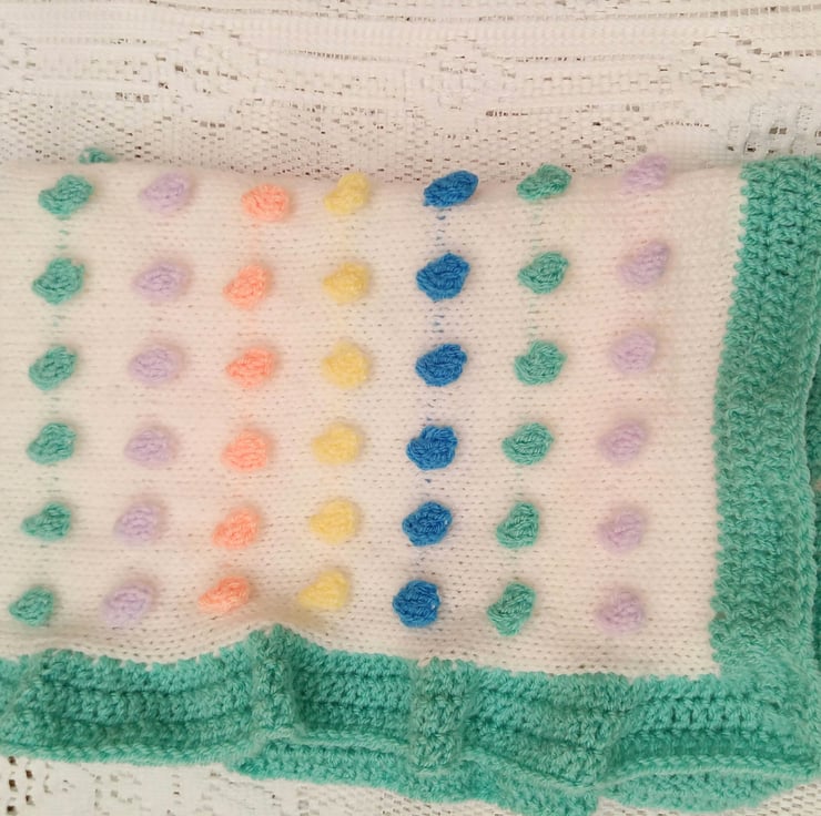 Gorgeous bobbly baby blanket. It is hand knitted in an acrylic double knitting weight yarn of multiple colours. The overall measurements of the blanket are approx. 25.5" (65 cm) x 17.5" (44.5 cm).