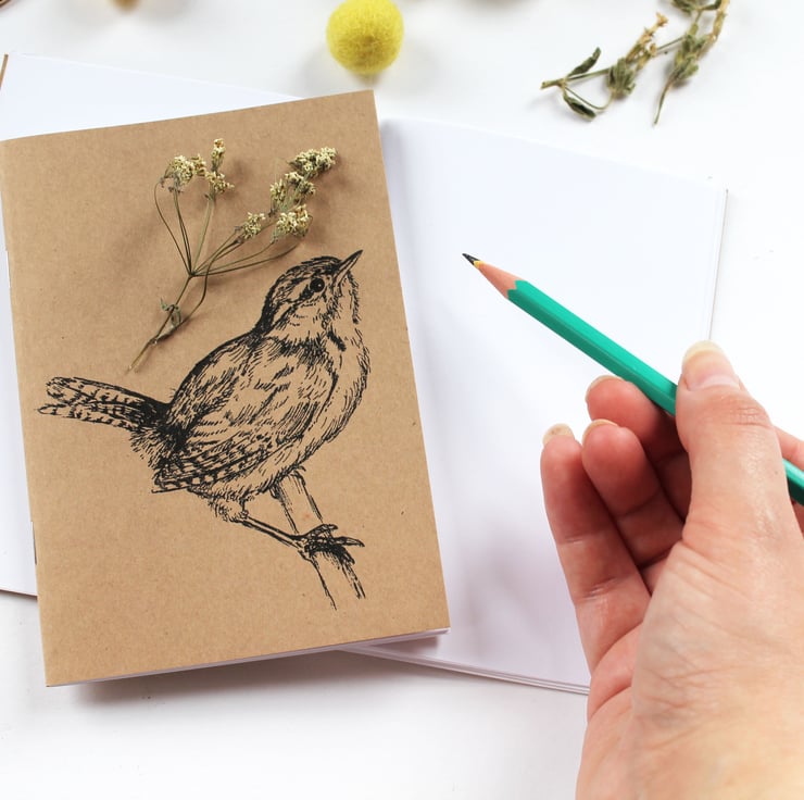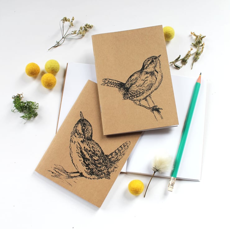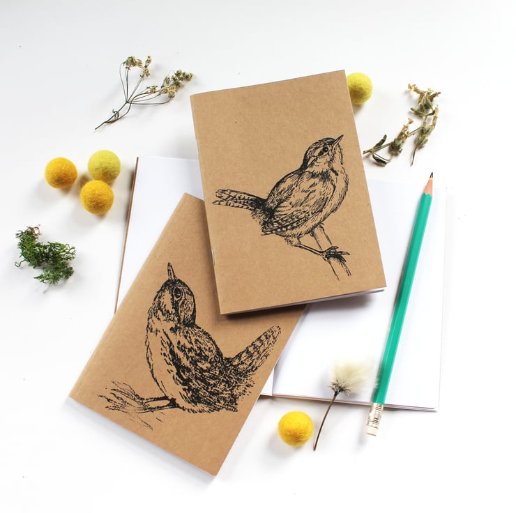 A6 Wren Pocket Notebook, a sweet wren the cover of this handy pocket notebook, you can choose from 2 designs, a standing wren or a perching wren. If you can't choose you can always get both for a special set price!