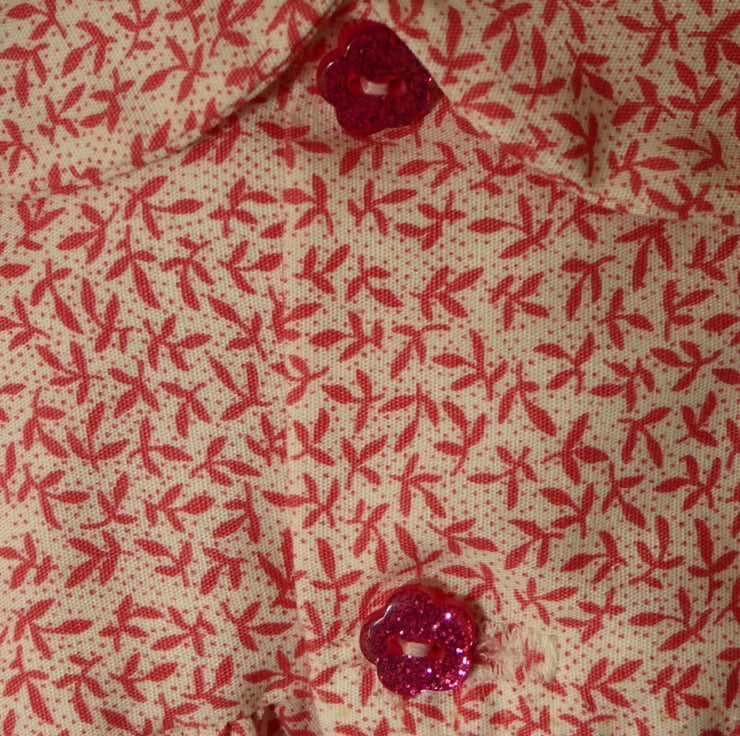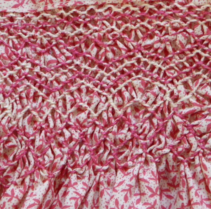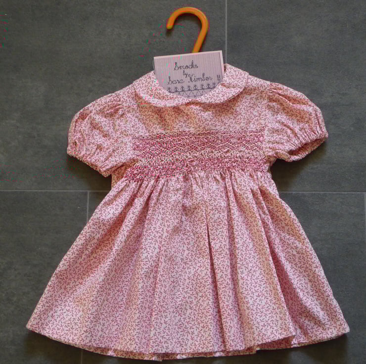Hand embroidered smocked dress, made in soft cotton poplin. Small pink leaf and stem design on cream background. Puffed sleeves with elasticated casing.