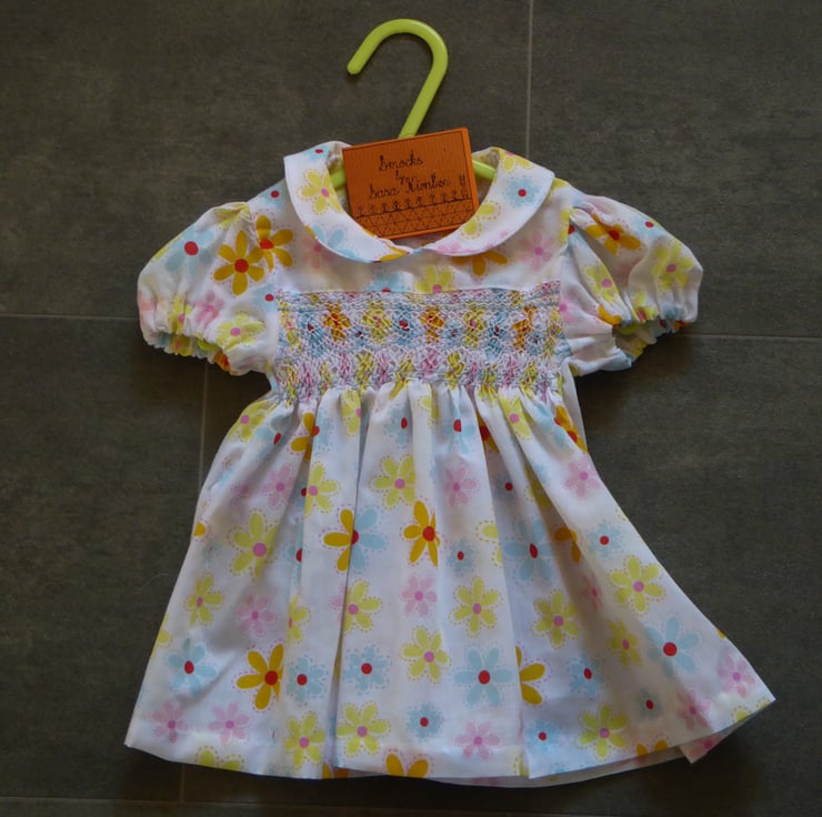 Hand embroidered smocked dress, made in soft easy care polycotton. Bright contemporary flower design on white background. Puffed sleeves with elasticated casing.