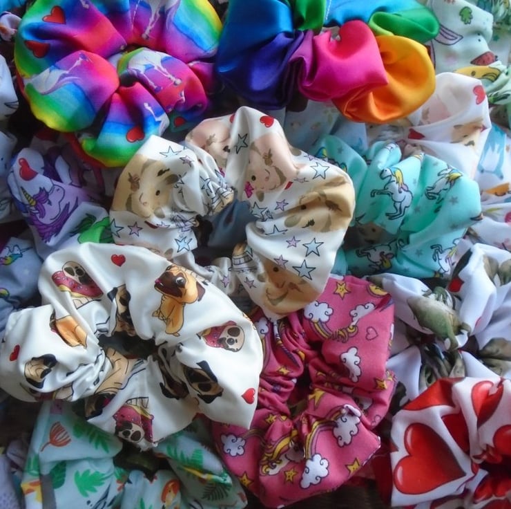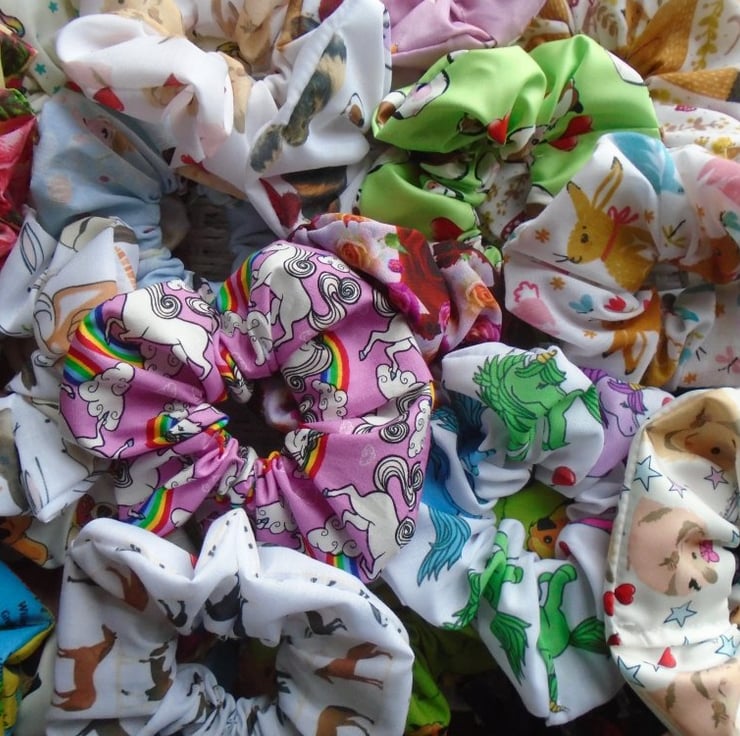 7 Mixed Random Themed Hair Scrunchies. Each one a universal size suitable for children teens or adults. Mixed fabrics including Cotton, Polycotton & Polyester. One for each day of the week! Designs include animals, magical creatures, dogs, cats, rainbows and lots more.