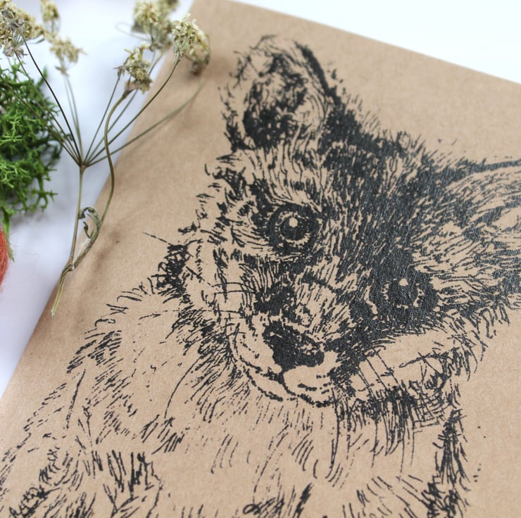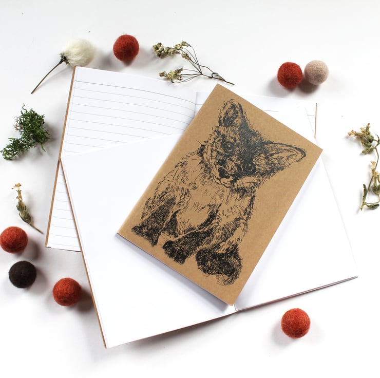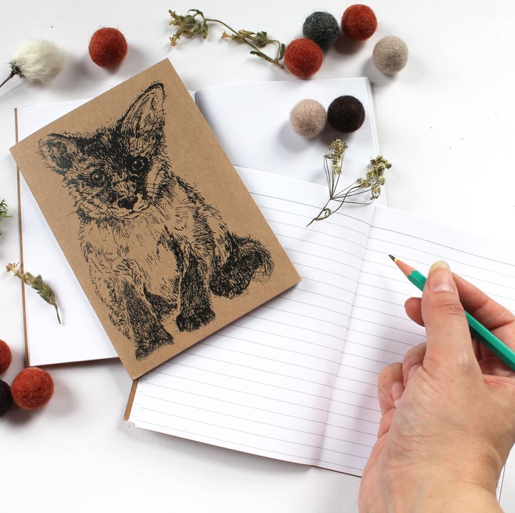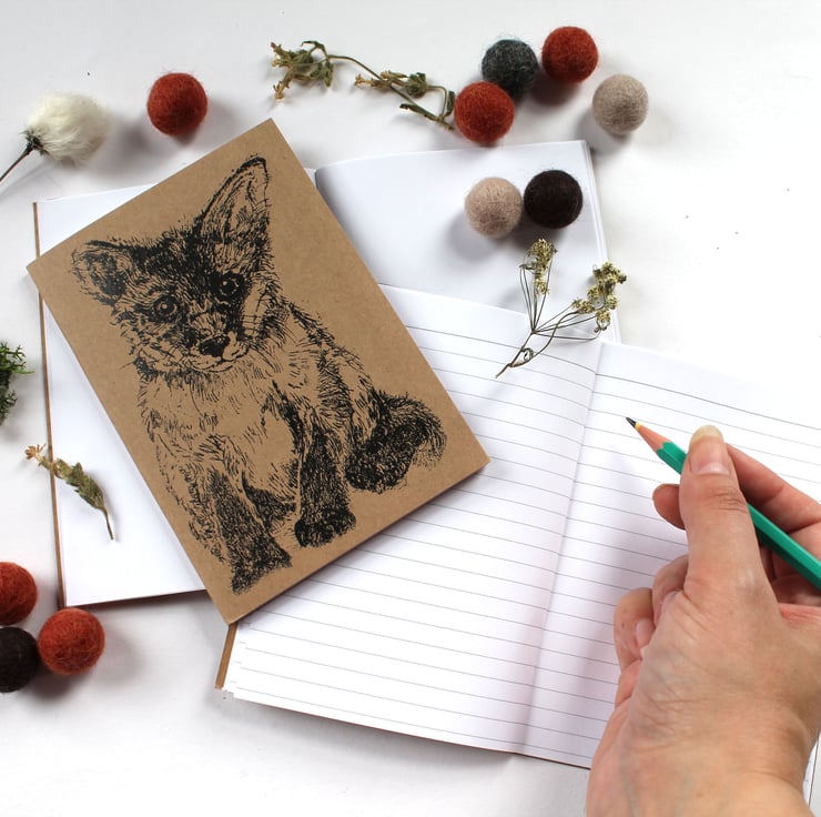 A Cute A6 Fox cub Pocket Notebook, this sweet fox sit with his head tilted curiously on the cover of this lovely little notebook. Perfect for doodles or lists, this notbook will slip easily into a pocket or handbag to go with you on your travels