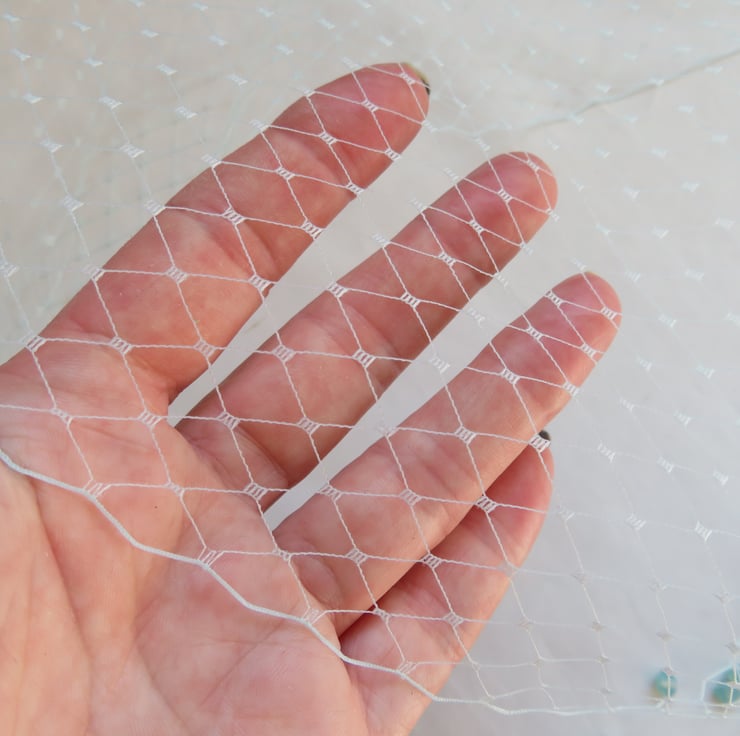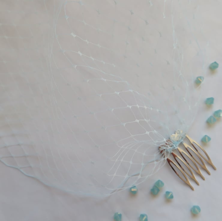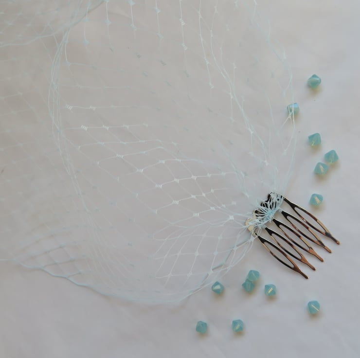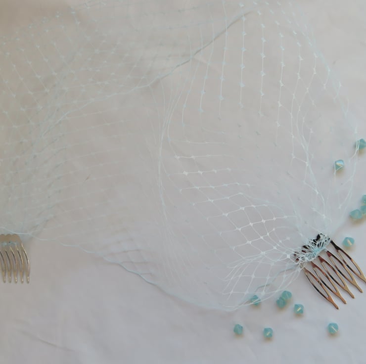 This is a bandeau birdcage style veil made from delicate pale aqua blue classic veiling.