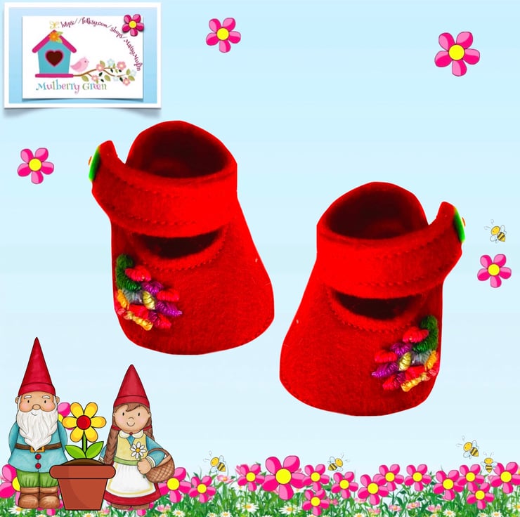 A cute little pair of red shoes, embroidered in rainbow colours, to fit the Mulberry Green characters. The shoes are hand stitched using double layers of felt and fasten with a popper underneath a little button.