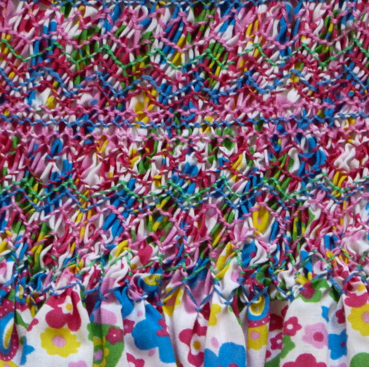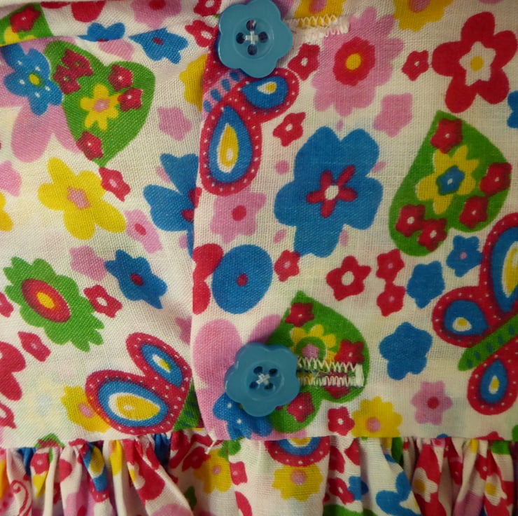 Hand embroidered smocked dress, made in easy care polycotton. Contemporary bright butterflies and flower design on a white background. Frill capped sleeves.