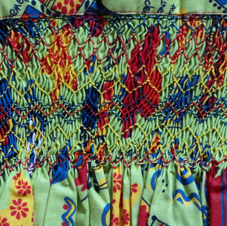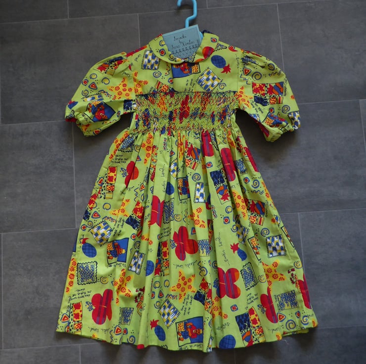 Hand embroidered smocked dress, made in cotton. Contemporary exotic continental print design on a bright golden yellow background. Puffed sleeves with elasticated casing.