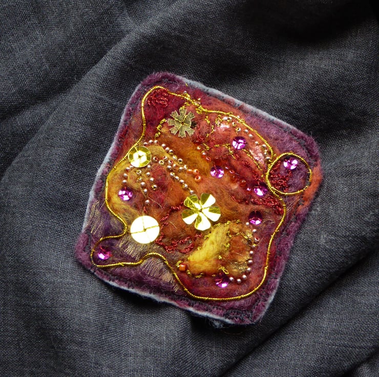 Textile felted shawl and scarf pin. Exciting wool roving colours are needle felted to form a firm base on grey felt with an added substantial brooch pin. Edges secured with machine embroidery. Decorated with hand embroidery using a variety of silk and metallic threads also adding stitched beads and sequins to sparkle.
