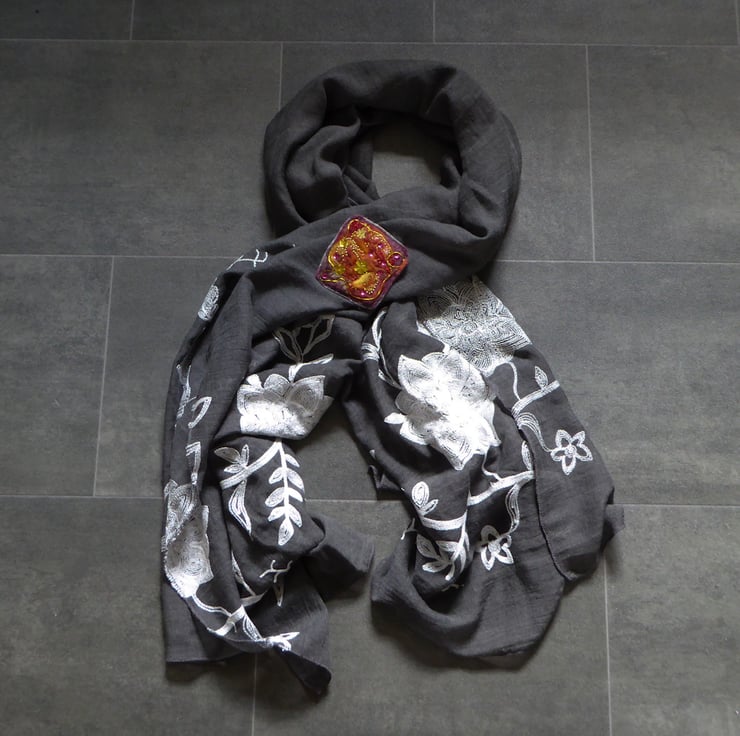 This pin will secure any shawl or scarf and be a colourful, tactile, lightweight textile handiwork.