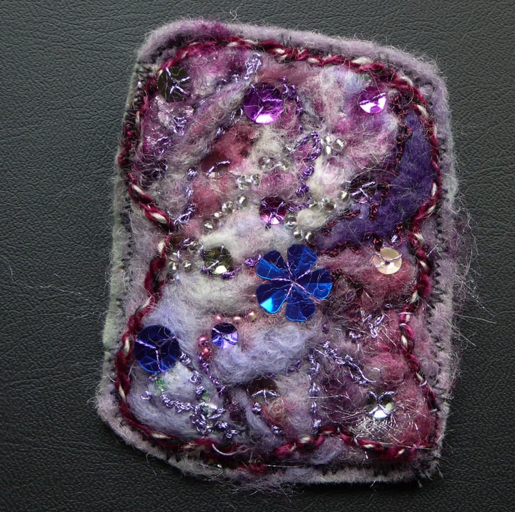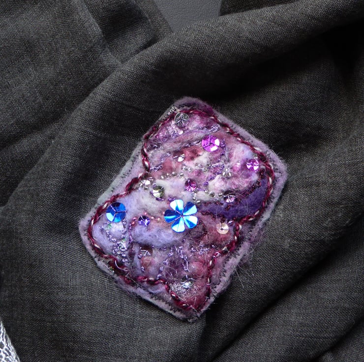 Textile felted shawl and scarf pin. Exciting wool roving colours are needle felted to form a firm base on grey felt with an added substantial brooch pin. Edges secured with machine embroidery. Decorated with hand embroidery using a variety of silk and metallic threads also adding stitched beads and sequins to sparkle.