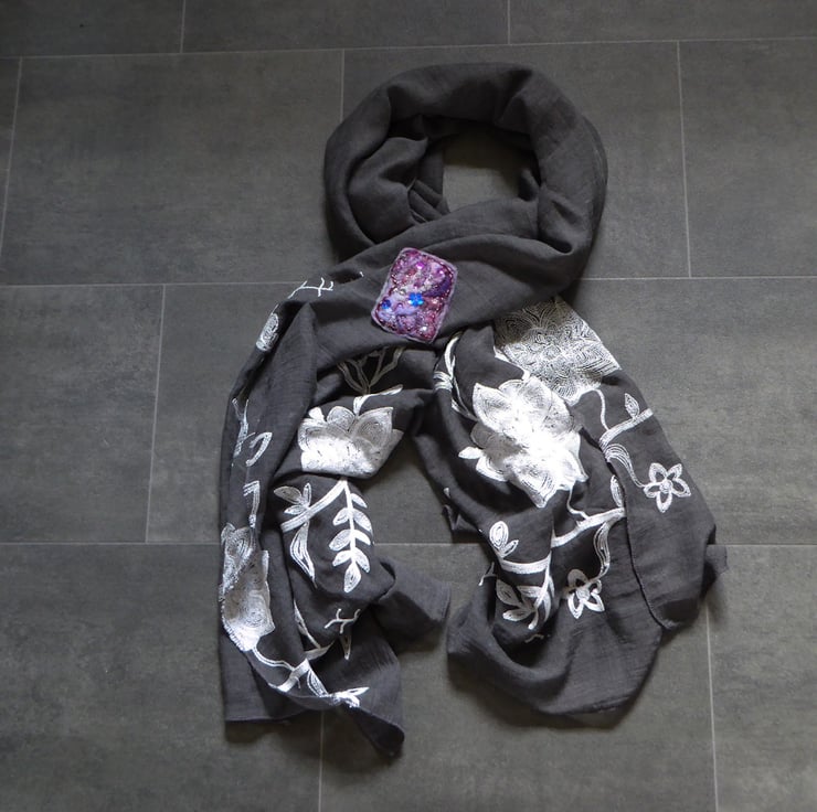 This pin will secure any shawl or scarf and be a colourful, tactile, lightweight textile handiwork.
