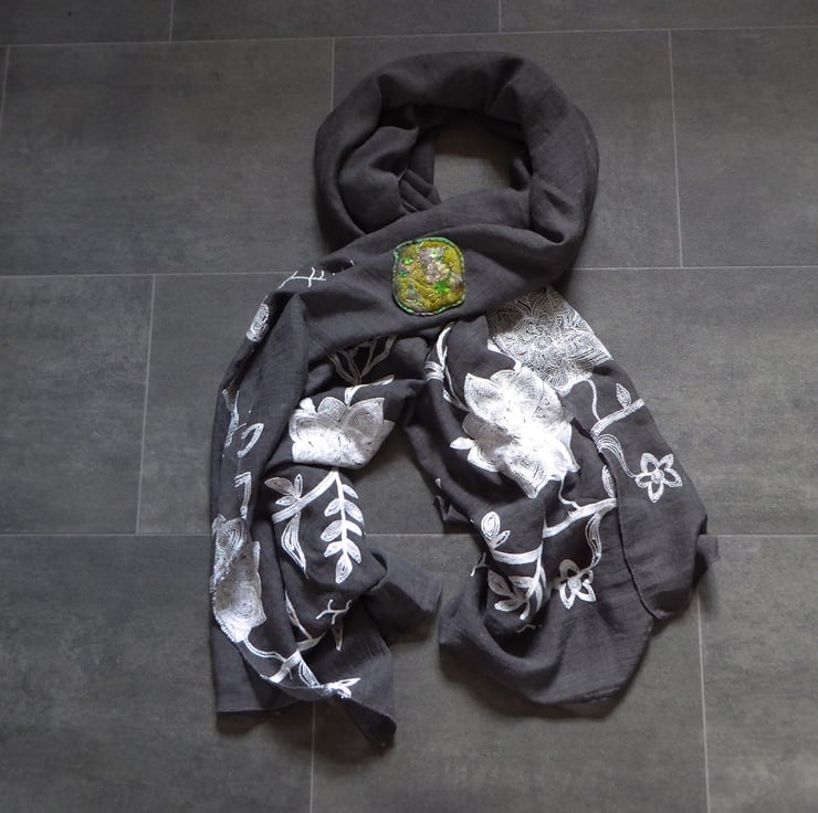 This pin will secure any shawl or scarf and be a colourful, tactile, lightweight textile handiwork.