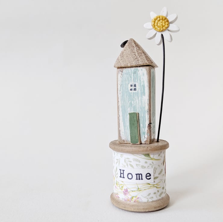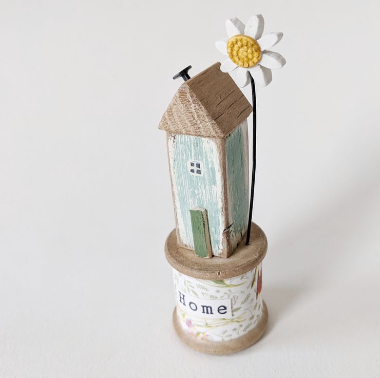 A hand painted little wooden house sits on a vintage bobbin. A patterned and painted clay daisy flower stands beside it.
