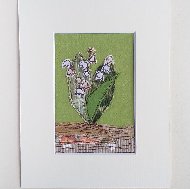 A small textile picture of lily of the valley. Each leaf and flower is individually hand cut then appliqued onto background fabric using free motion embroidery.