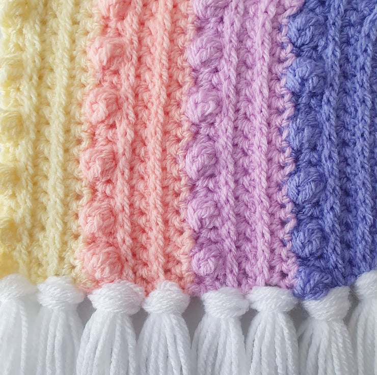 A beautiful rainbow wall hanging crocheted in a funky modern bobble stitch style.