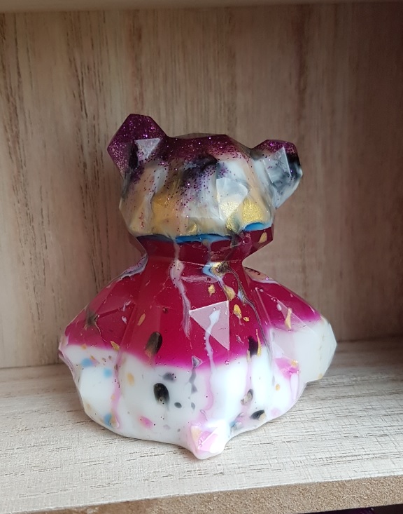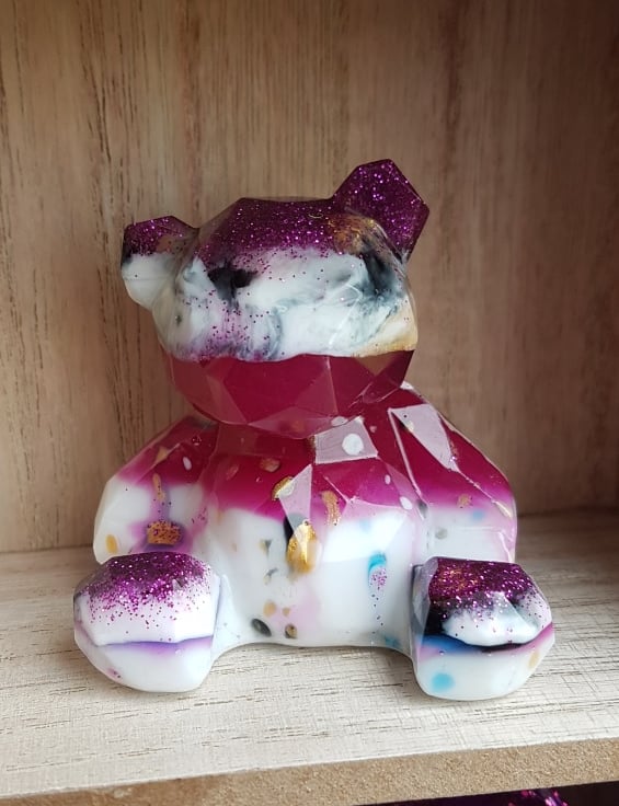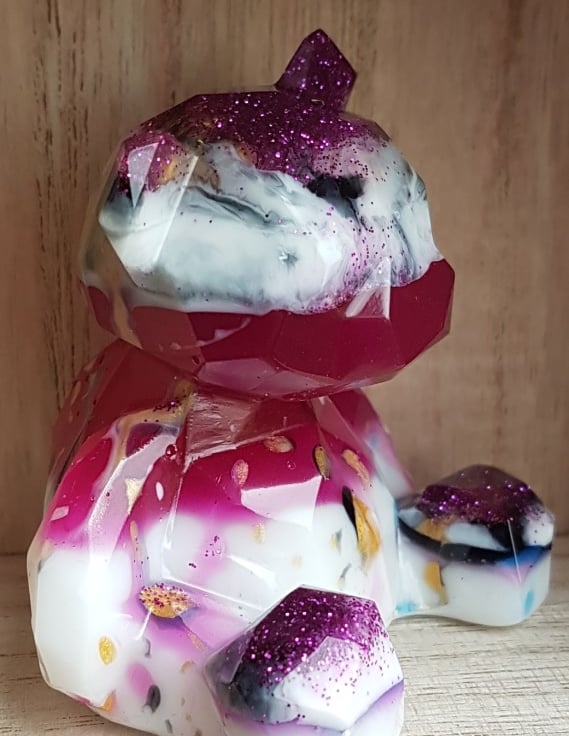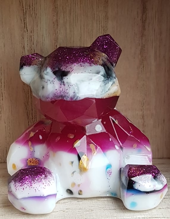 Lovely Raspberry Ripple Resin Bear, gorgeous in its Pink, Purple, Gold and White colours. This abstract little bear is a sweet little character and is made from layers of colourful resin. This Bear is Numbered 21.
