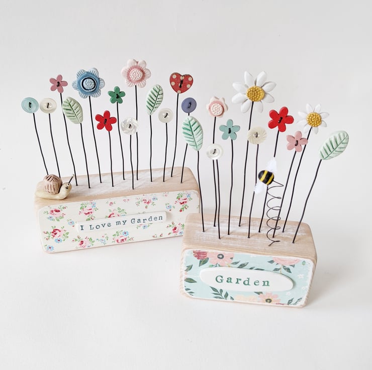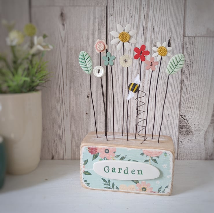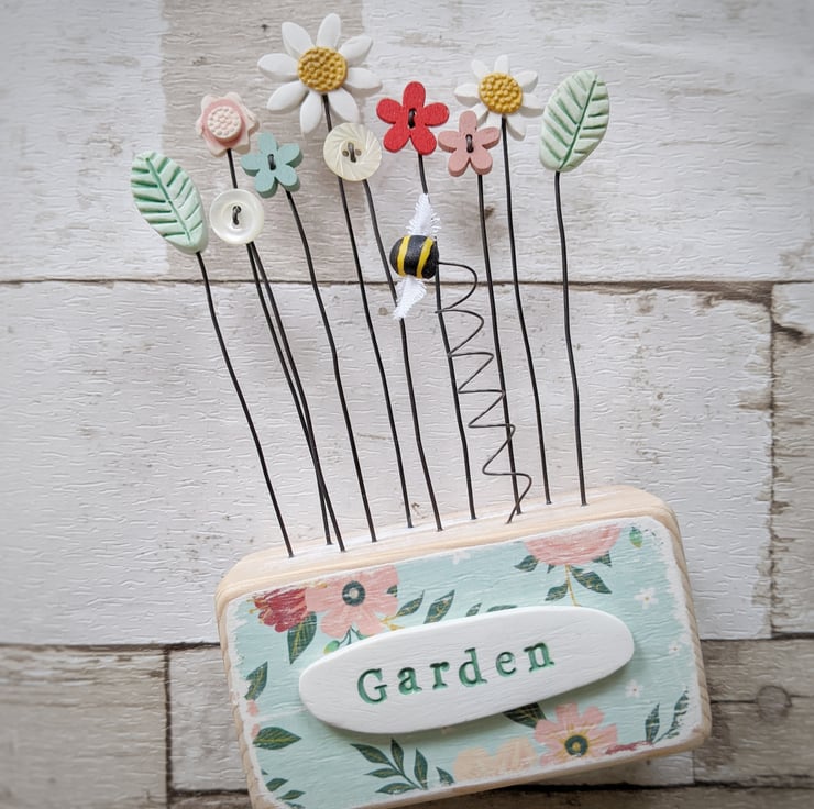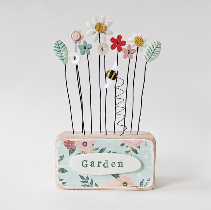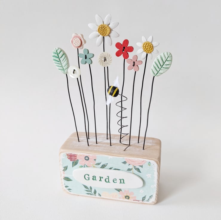 There are little wooden button flowers and vintage mother of pearl ones. They dance alongside daisies, flowers and leaves made from polymer clay. This is hand moulded, fired and painted to finish.