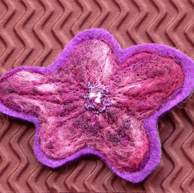 Brooch or lightweight scarf pin. Exciting wool roving colours are needle felted to form a firm base on coloured felt with a stitched on brooch pin. Edges secured with machine stitching. Decorated with machine and hand embroidery using a variety of silk and metallic threads also adding stitched beads to add sparkle.