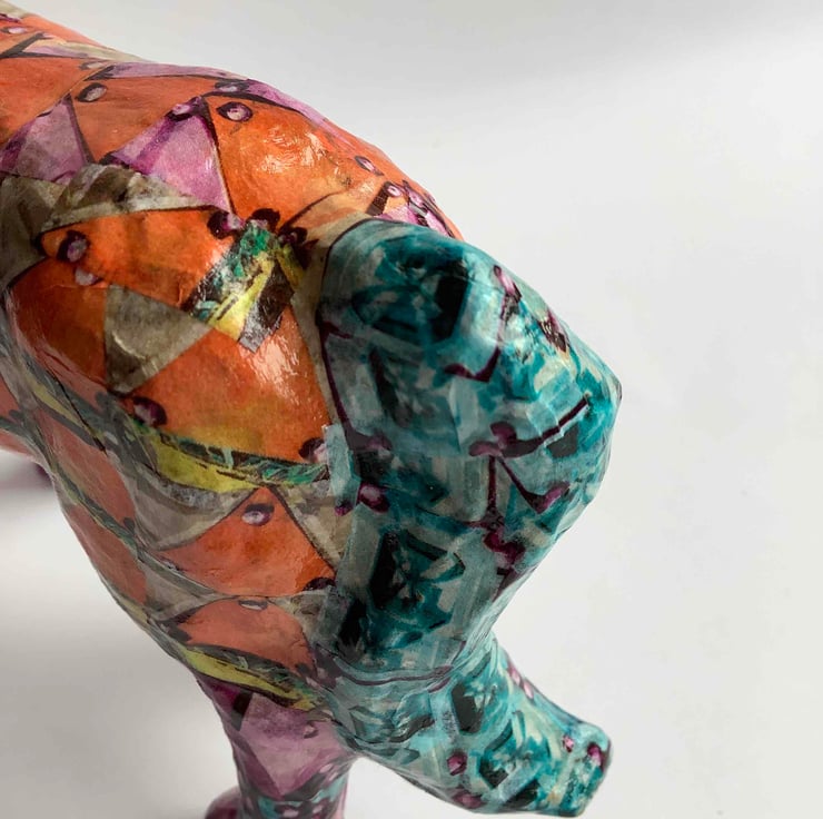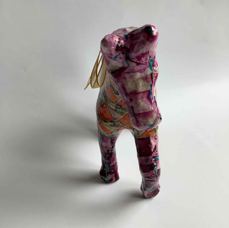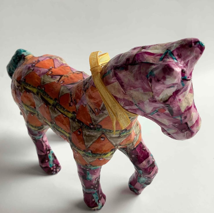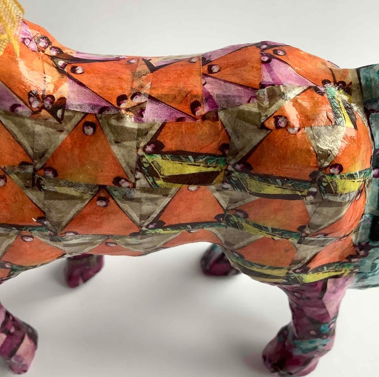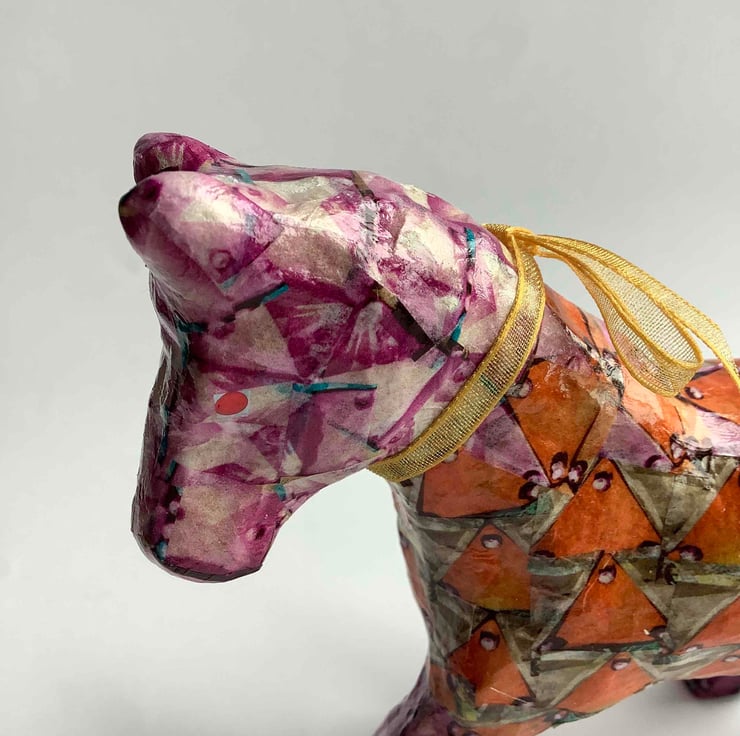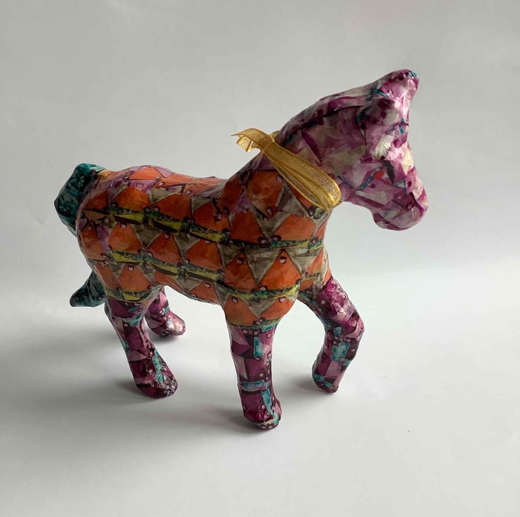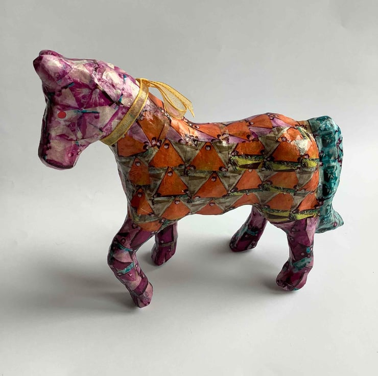 This is a papier mache horse which has been Decopatched in these colourful papers and then varnished. It has a gold coloured organza ribbon tied round its neck.