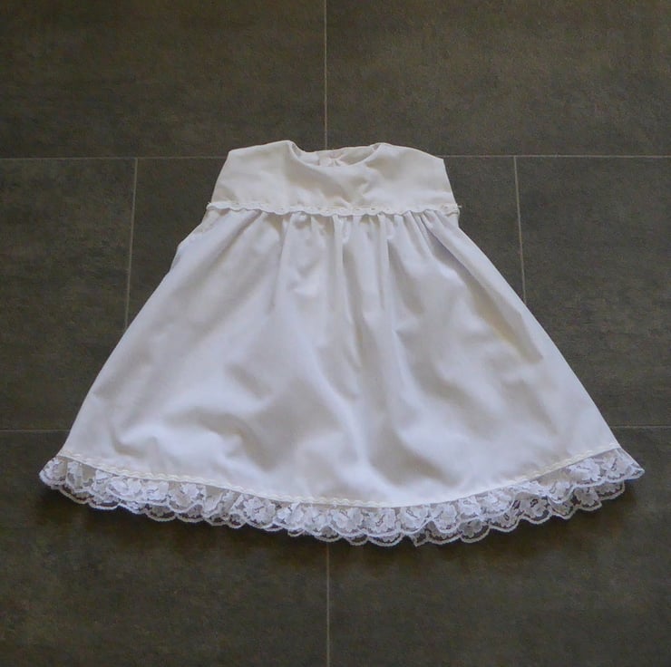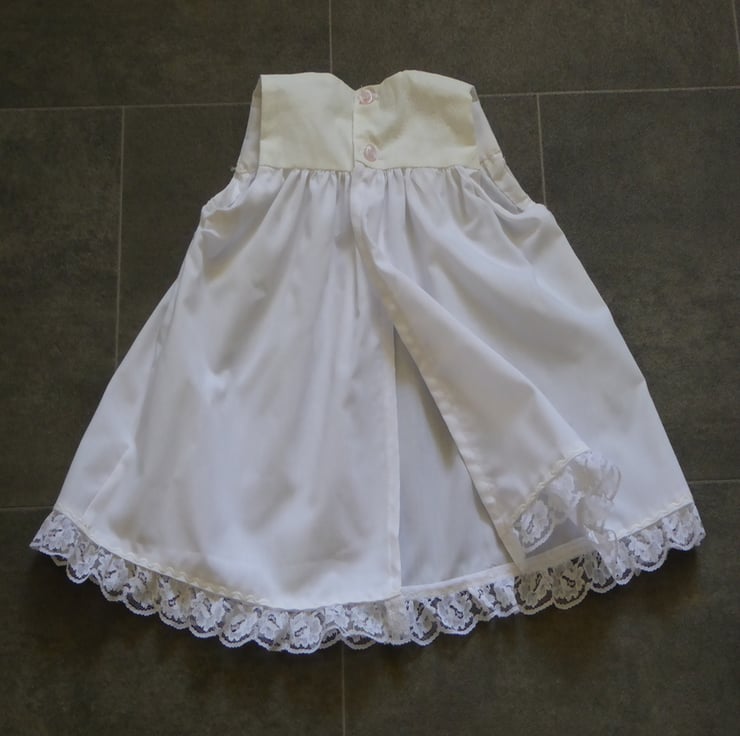 Heirloom hand embroidered deep smocked short dress with lace trimming for that special occasion. Dress made in white spotted cotton poplin with a separate under petticoat in soft lace trimmed poplin. Frilled capped sleeves to allow t shirt layer to be worn underneath for added warmth or without as a cool sundress. Finished with french seams for that added 'heirloom' quality.