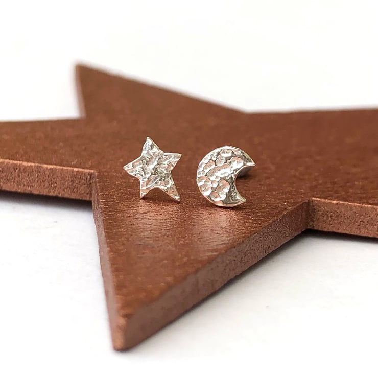These stylish crescent moon and star earrings are handmade in sterling silver. The intricate design is excellent for both evening and daytime wear. The mismatched earrings are unique and will make an adorable addition to your wardrobe.