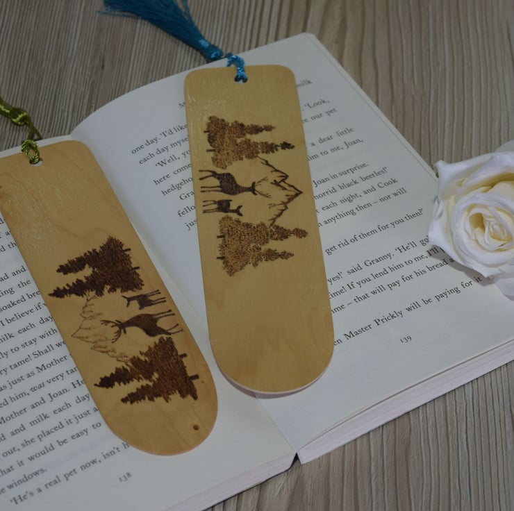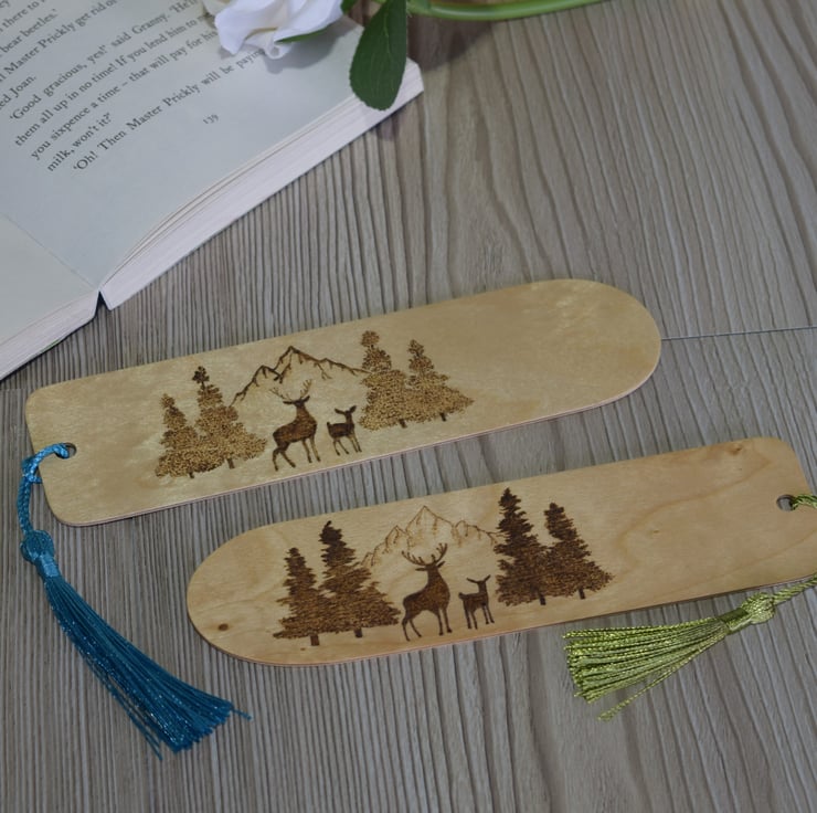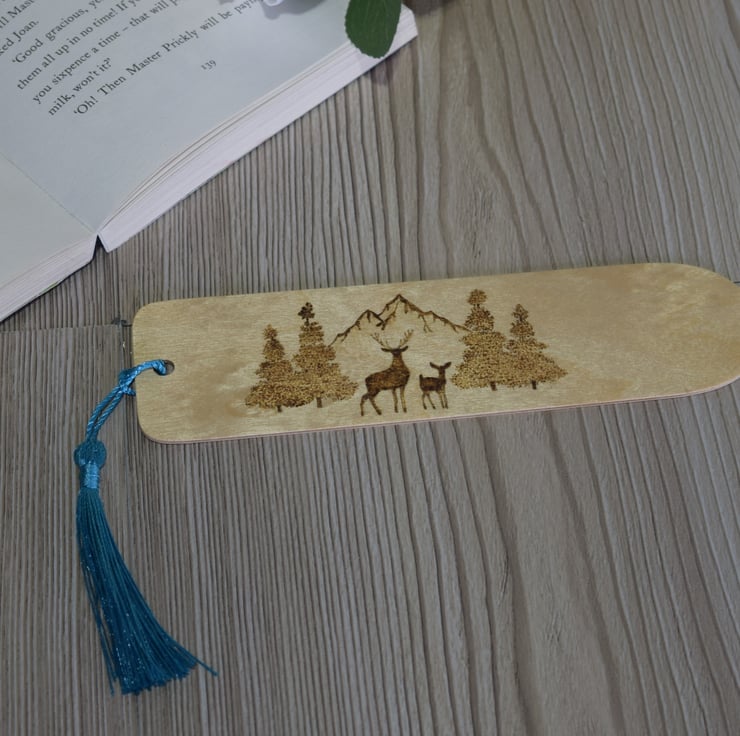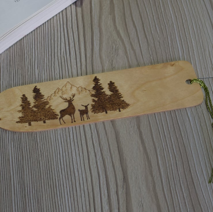 A large wooden birch ply bookmark with a Mountain adventure scene with a pair of deer. pyrography design.