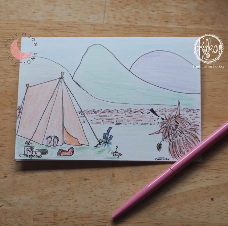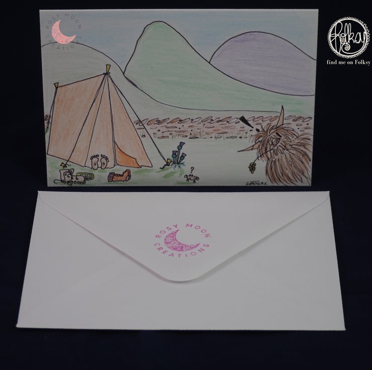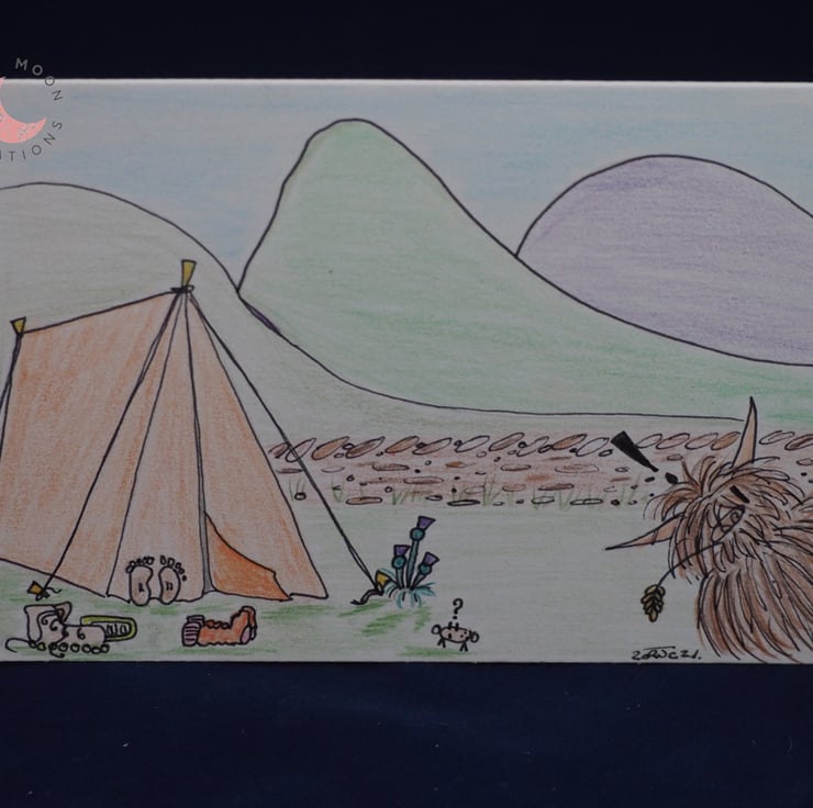 A fun card with my favourite highland cow, Morag who is slightly perturbed by the camper who has pitched up in her field. Her little haggis buddy is equally baffled.