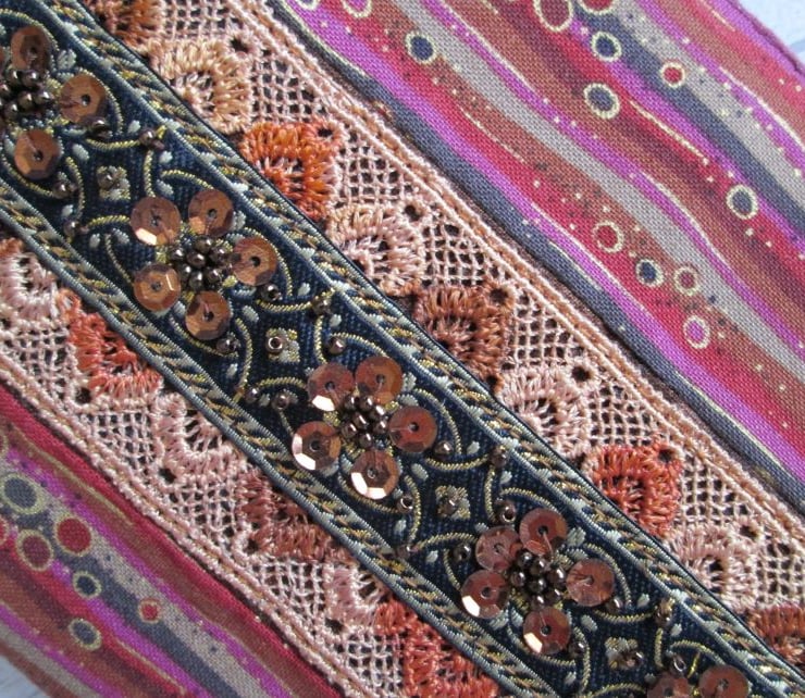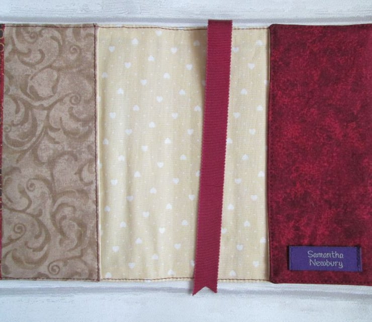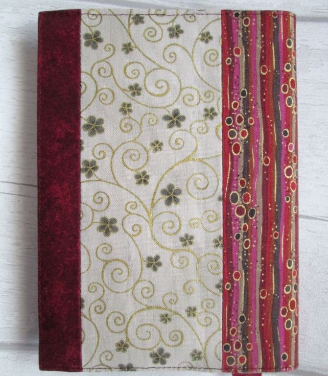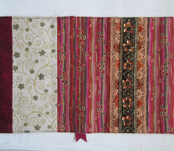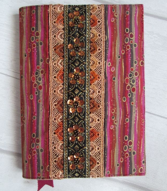 Definitely one of a kind, this patchwork notebook cover is made from a selection of coordinating pieces chosen from my scrap-box of treasures. I've added some unusual pieces of lace and a length of sequined braid to create a feature panel on the front, and incorporated a handy ribbon place marker. Comes complete with an A6 hardback, lined notebook.