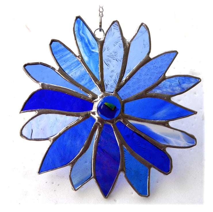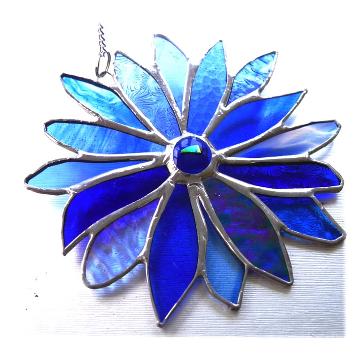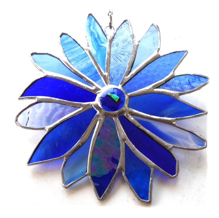 The flower has 16 petals, all slightly different shapes and types of blue glass. In the centre is a special blue glass nugget with dfichroic accents which I fused in my kiln.