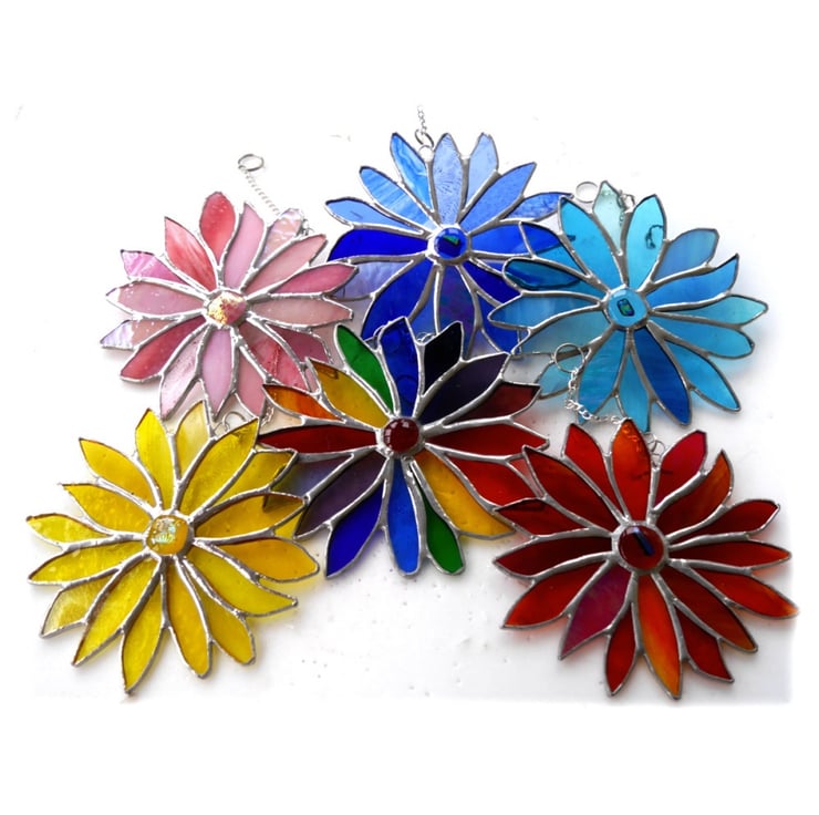 A silver coloured little chain is securely attached by solder to the top of the Flower with a little ring to hang it.