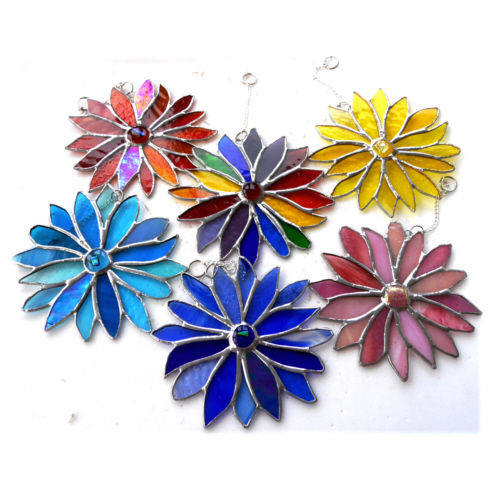 This is a stained glass suncatcher made using the Tiffany copper foil technique.