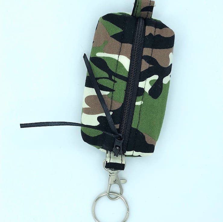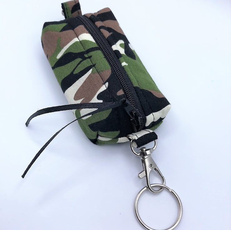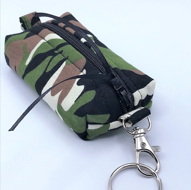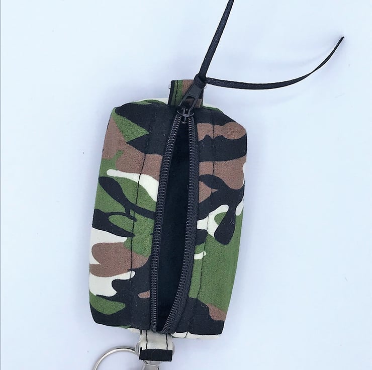 This useful fully lined camouflage zipped keyring bag is perfect for keeping your face mask handy on your bag. It can also be used to keep dog treats and bags, lipstick, earphones, etc.