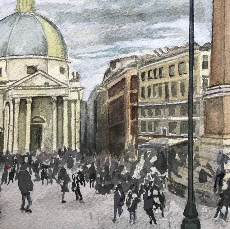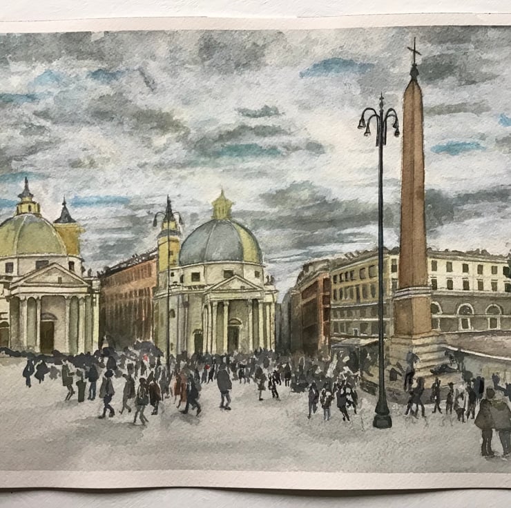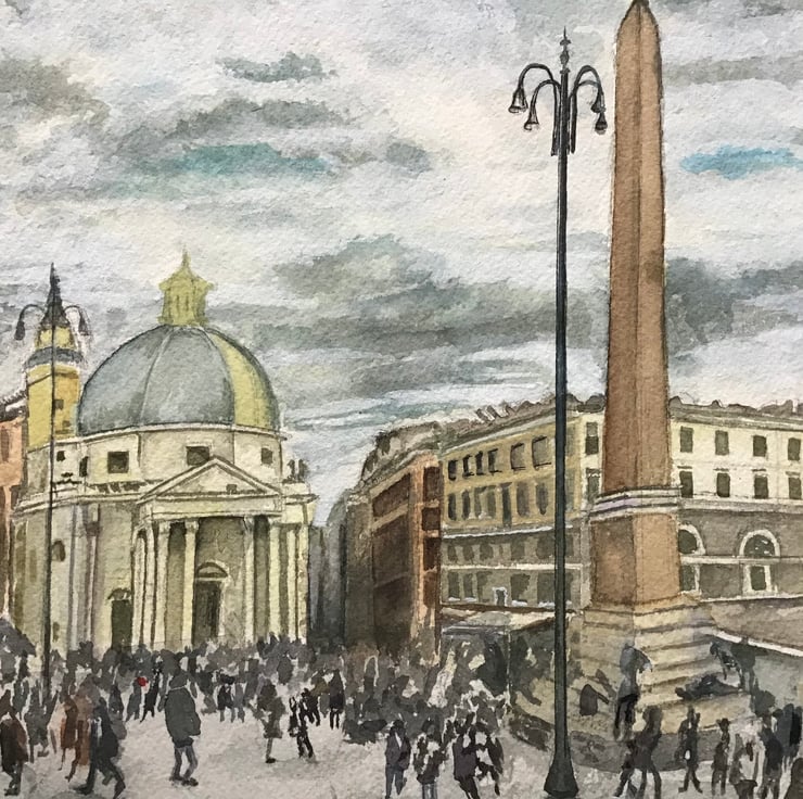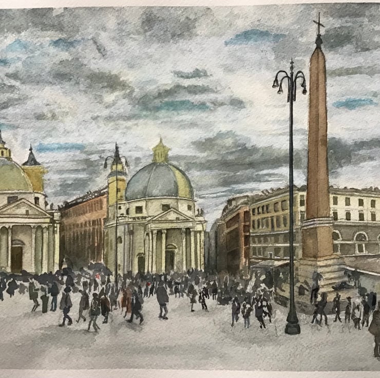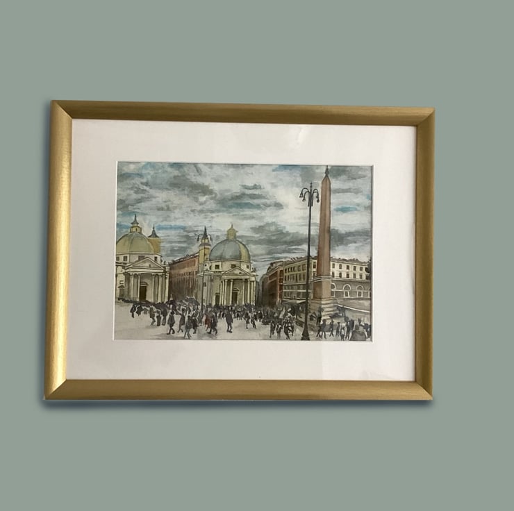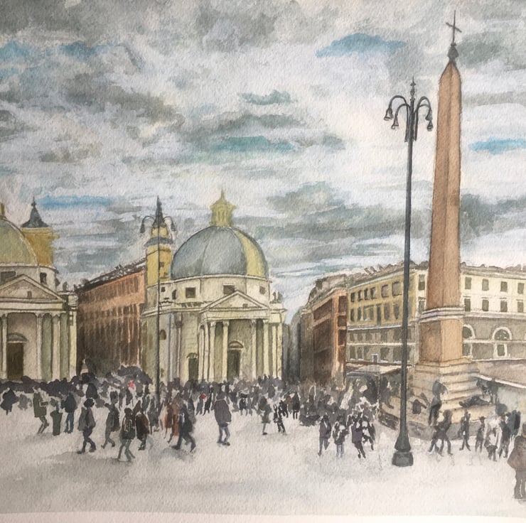Watercolour painting of Piazza del Popolo in Rome. The People’s square with the twin churches painted on Arches 300gsm 100% cotton watercolour paper. 26cm x 36cm. Sold without mount or frame.
