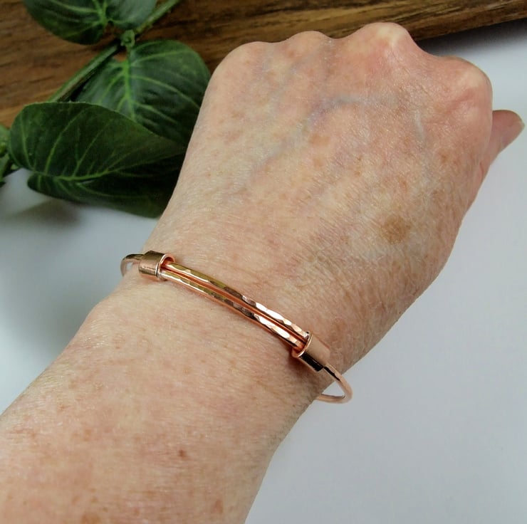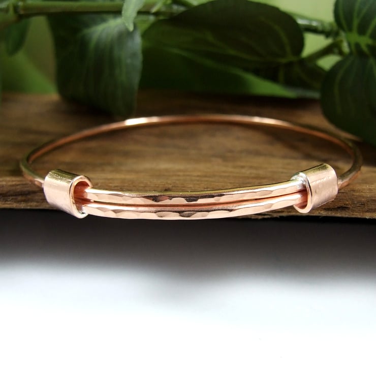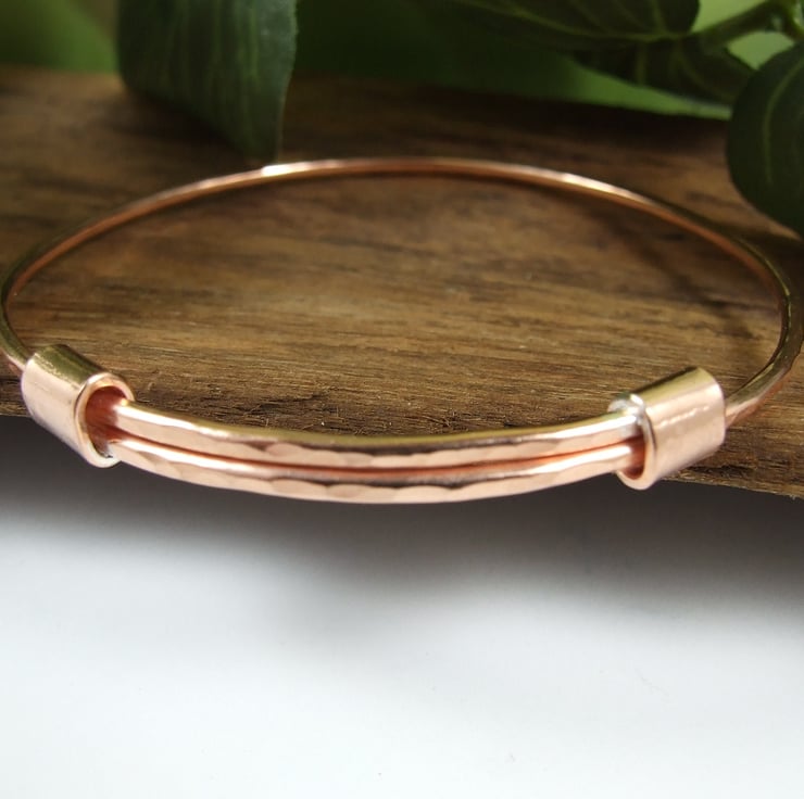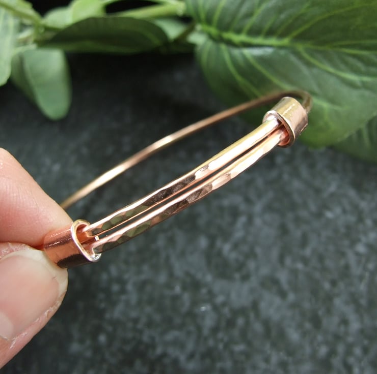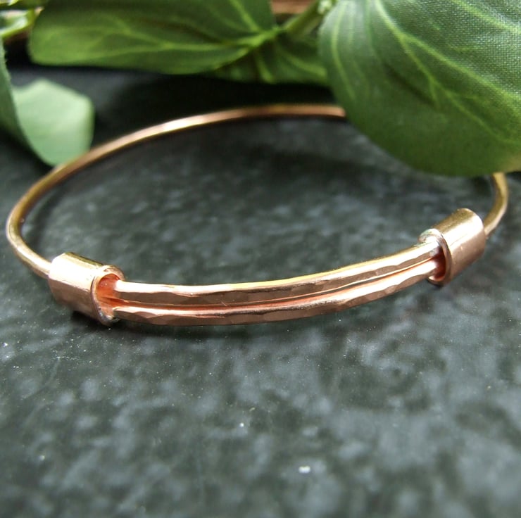 I have made the bangle from 2mm wide pure copper wire, hammered for texture and then solderd in place two sliders overlapping to create an adjustable fit and given it a bright polished finish.