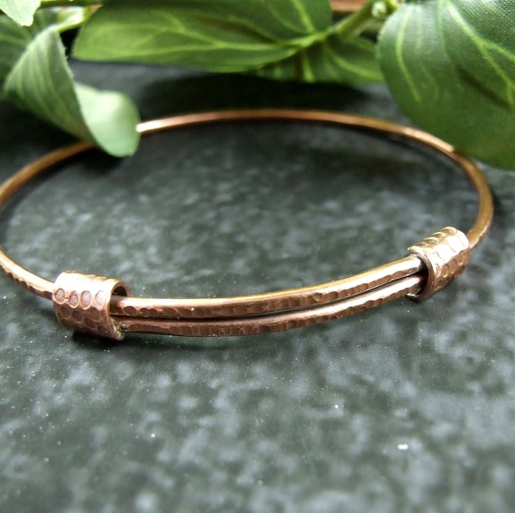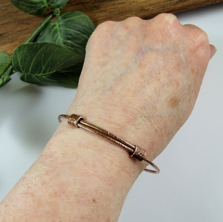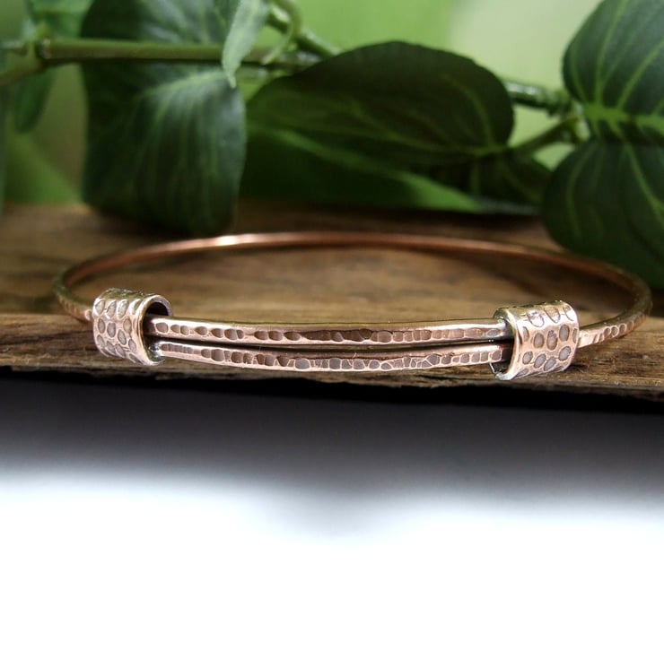 I have made the bangle from 2mm wide pure copper wire, hammered for texture and then solderd in place two sliders overlapping to create an adjustable fit and given it an antiqued oxidised finish.
