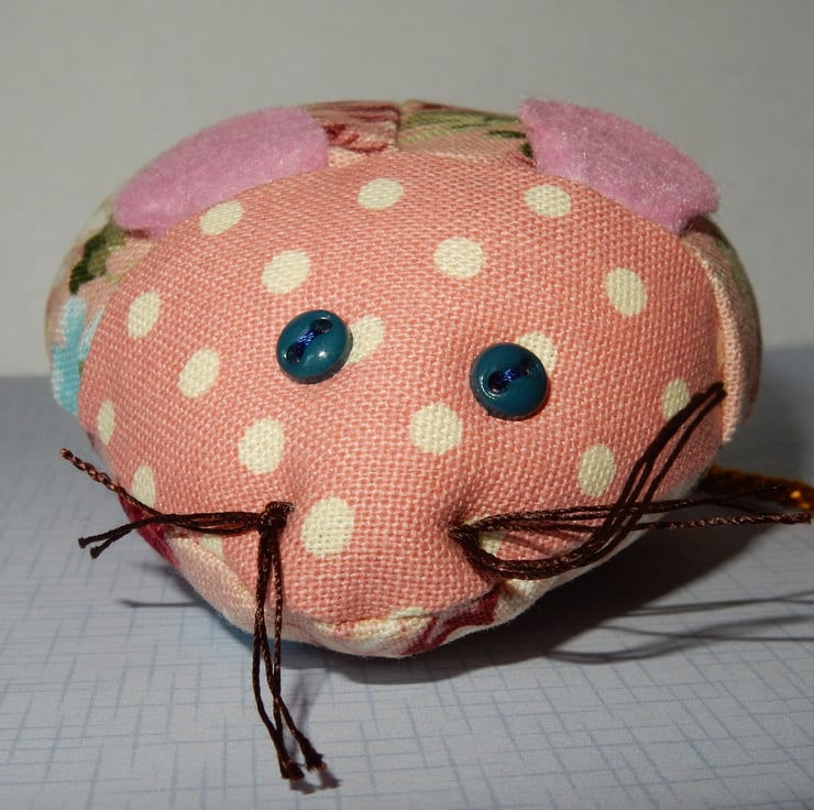 This pretty floral mouse pin cushion will add a touch of luxury to your sewing area or sewing basket. She's very pretty, made from a floral and spot print fabric combination, she measures approximately 4 x 3 inches, (11 x 7 cm.) not including her tail.