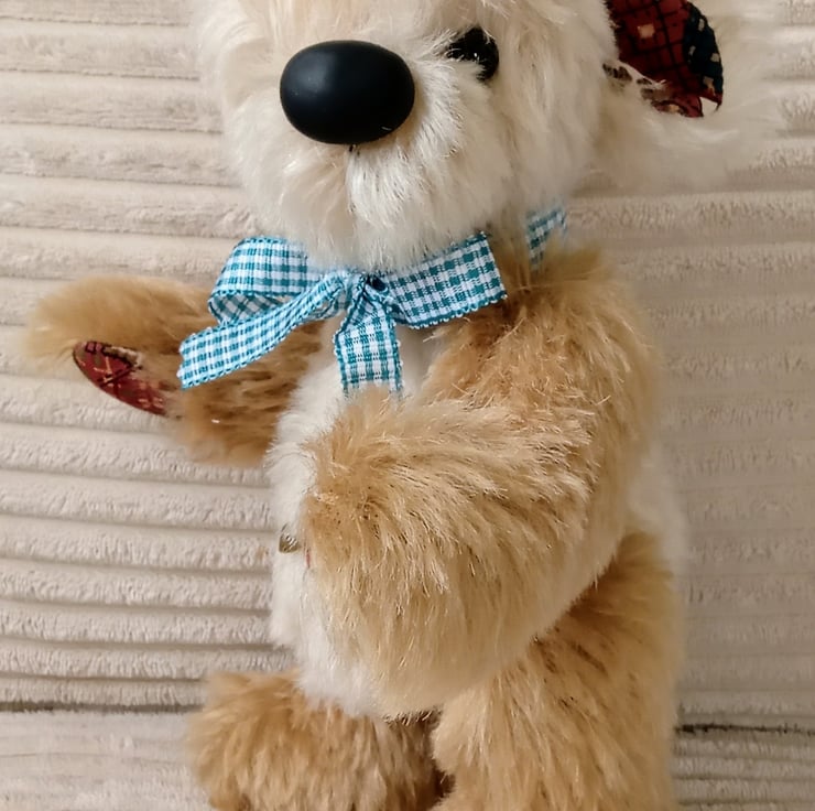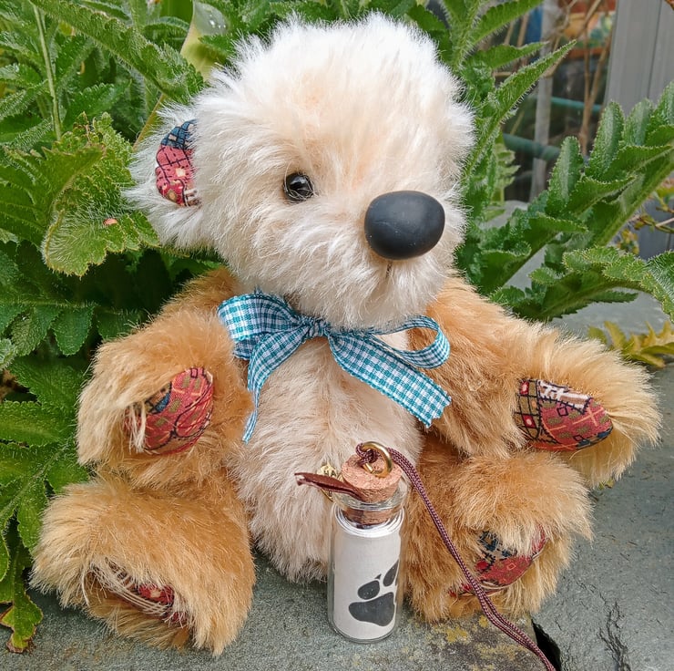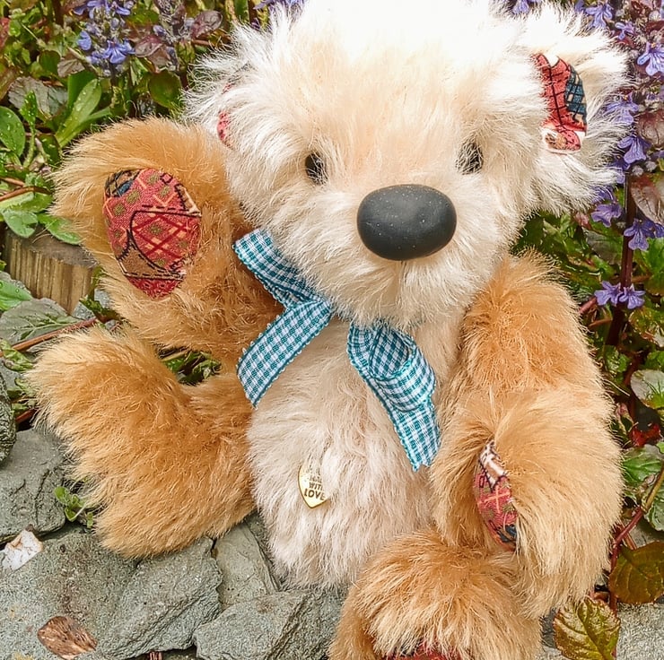 My name is Butterscotch and I am a one of a kind bear hand sewn by Karen Blake using quality mohair fabric. Glass eyes, a hand crafted nose, printed cotton paw pads and a hand sewn mouth are all positioned to give me a unique character. I am able to move my head, arms and legs thanks to the cotter joints which help bring me to life, and as with all Summertree bears I have a heart shaped pendant attached to my belly which reads 'hand made with love'. When I am sitting down I am approximately 6 inches or 15cm high, so won't take up too much room. I certainly am one of a kind and will put a smile on your face.