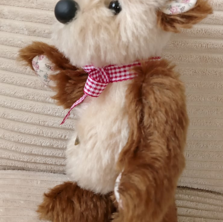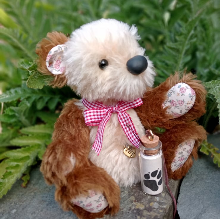 My name is Bonnie and I am a one of a kind bear hand sewn by Karen Blake using quality mohair fabric. Glass eyes, a hand crafted nose, printed cotton paw pads and a hand sewn mouth are all positioned to give me a unique character. I am able to move my head, arms and legs thanks to the cotter joints which help bring me to life, and as with all Summertree bears I have a heart shaped pendant attached to my belly which reads 'hand made with love'. When I am sitting down I am approximately 6 inches or 15cm high, so won't take up too much room. I certainly am one of a kind and will put a smile on your face.