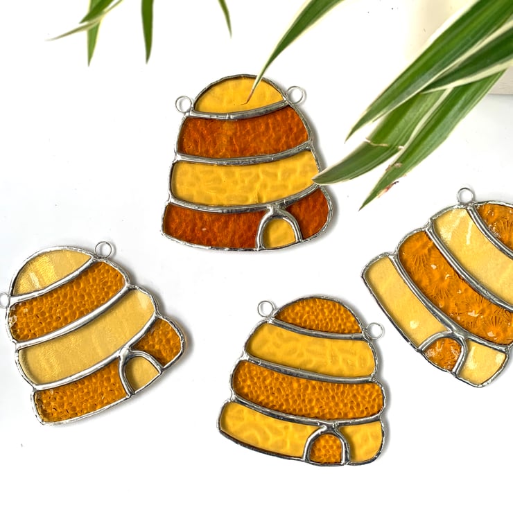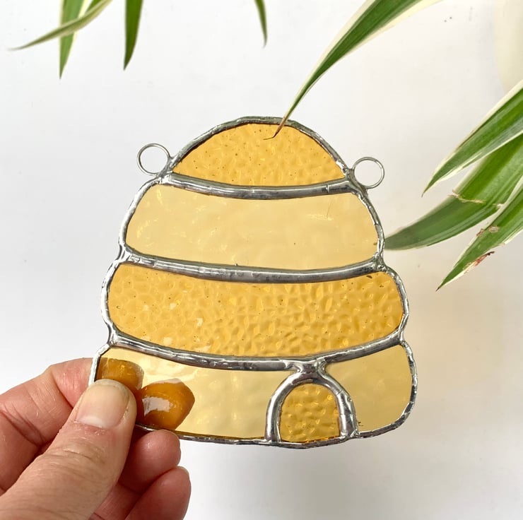 Each piece of glass has been hand cut, ground, washed, foiled and soldered before being washed again and polished. Two rings and a length of line has been attached for hanging purposes.