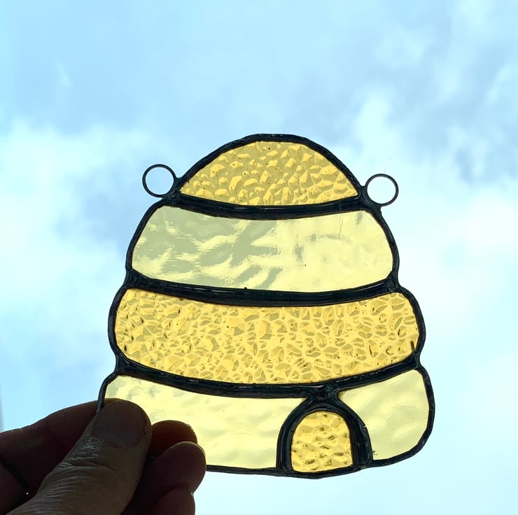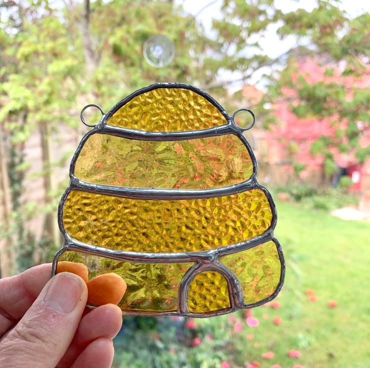 The glass used for this suncatcher Is amber muffle glass and amber sparkle glass. Both have lovely texture and make this look very pretty.